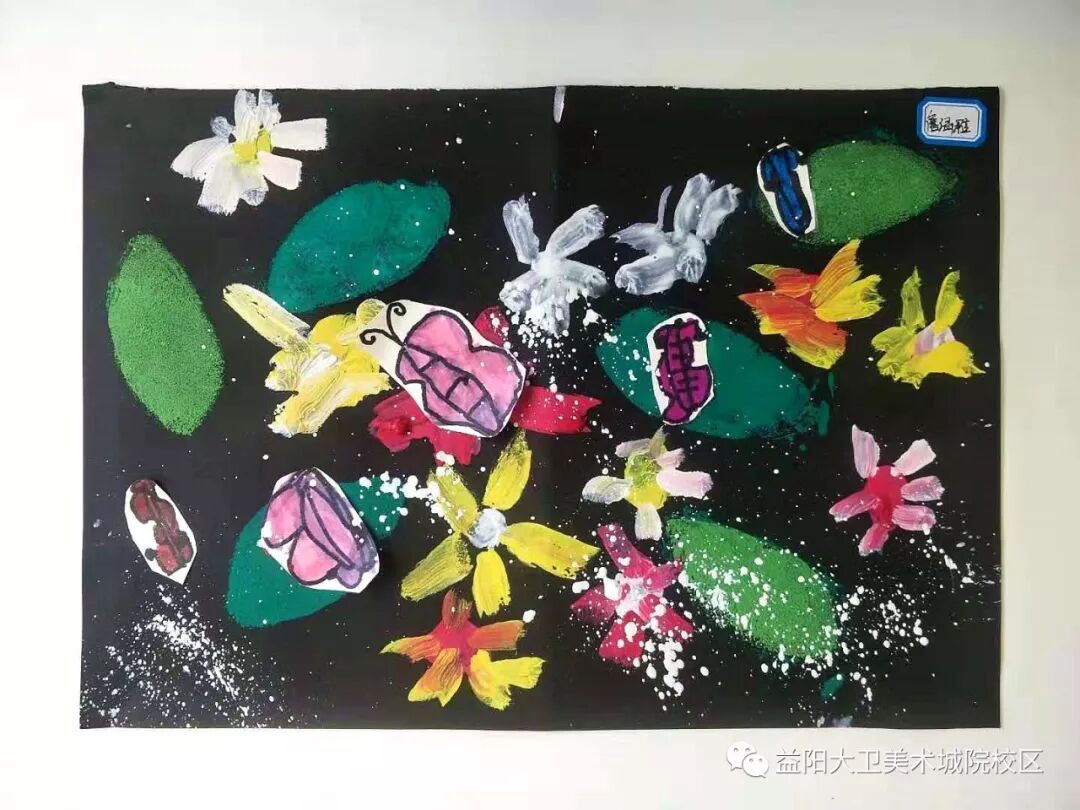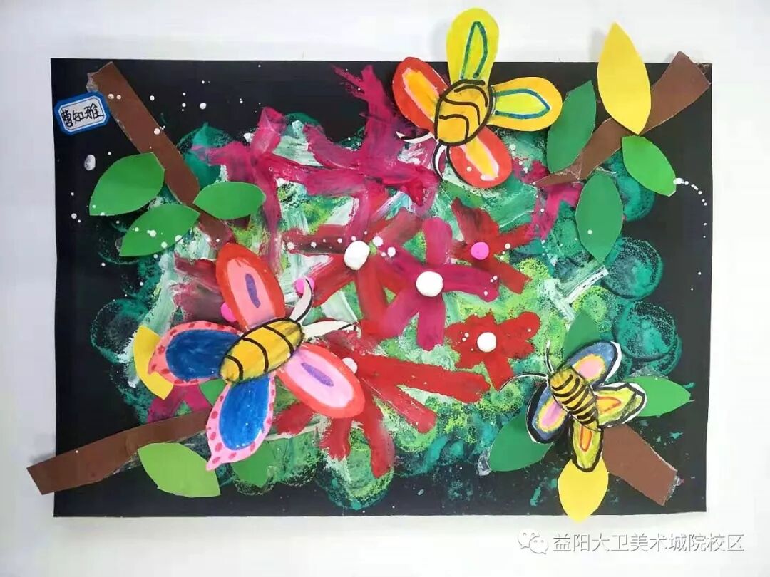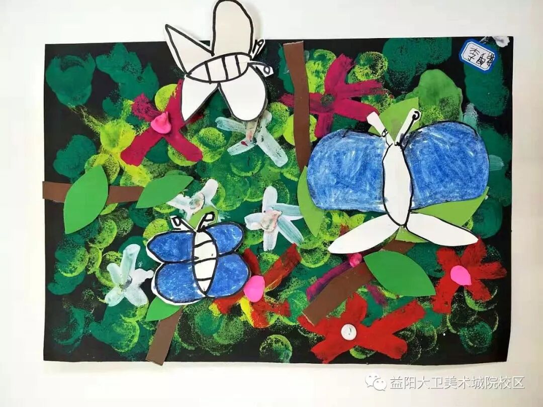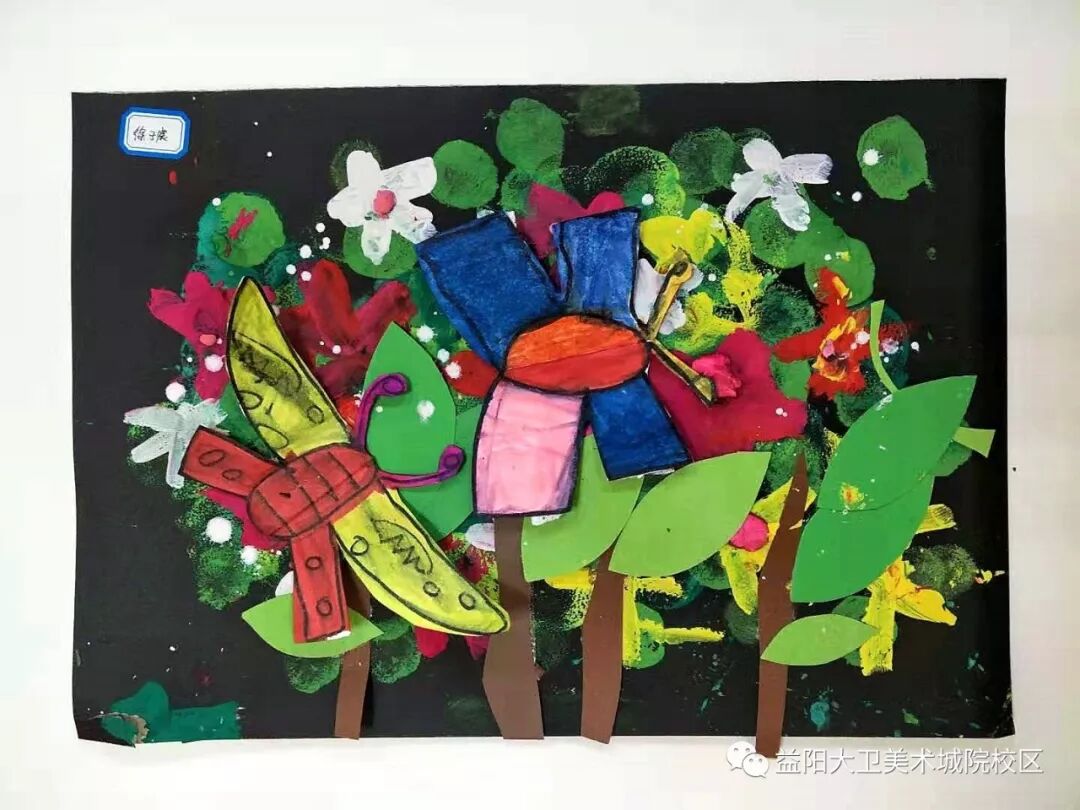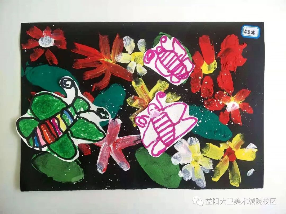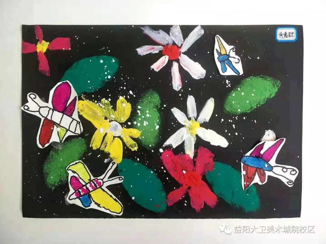 《花丛里的蝴蝶》主要学习了形状的对称和色彩的深浅变化。作品以水彩颜料和勾线笔水彩笔上色的形式完成,用海绵棒拓印出花丛的背景,画上各种颜色的小花朵,运用对称画出一只只漂亮的小蝴蝶。