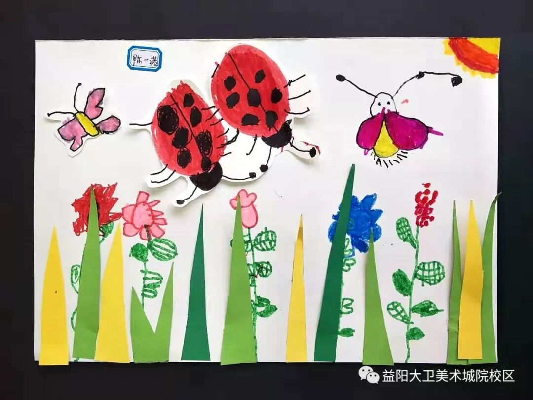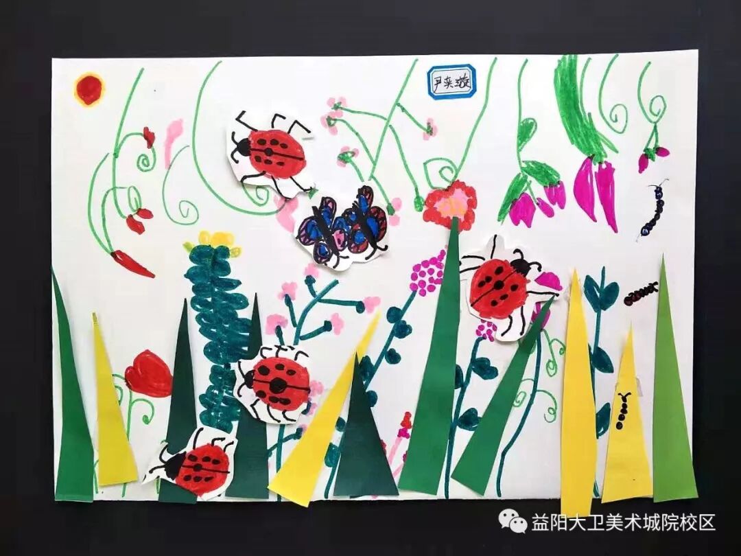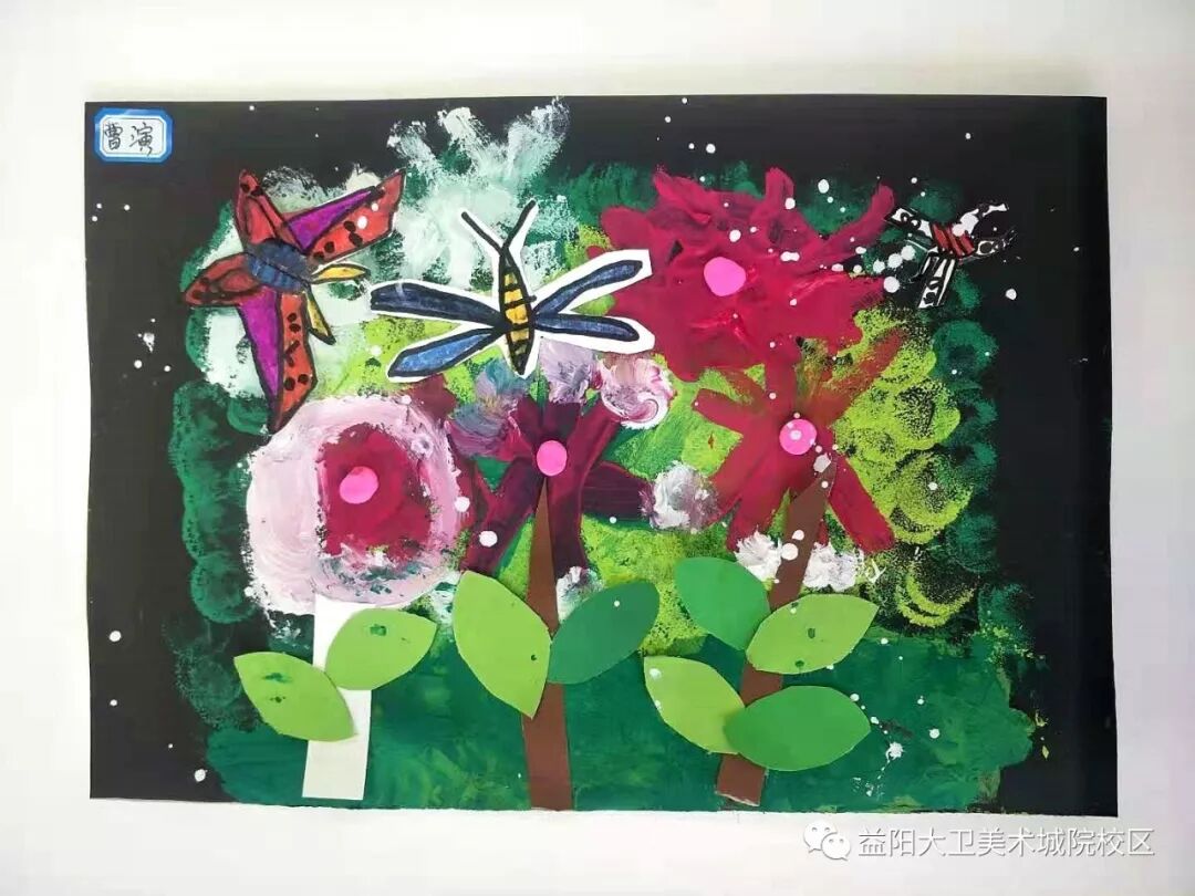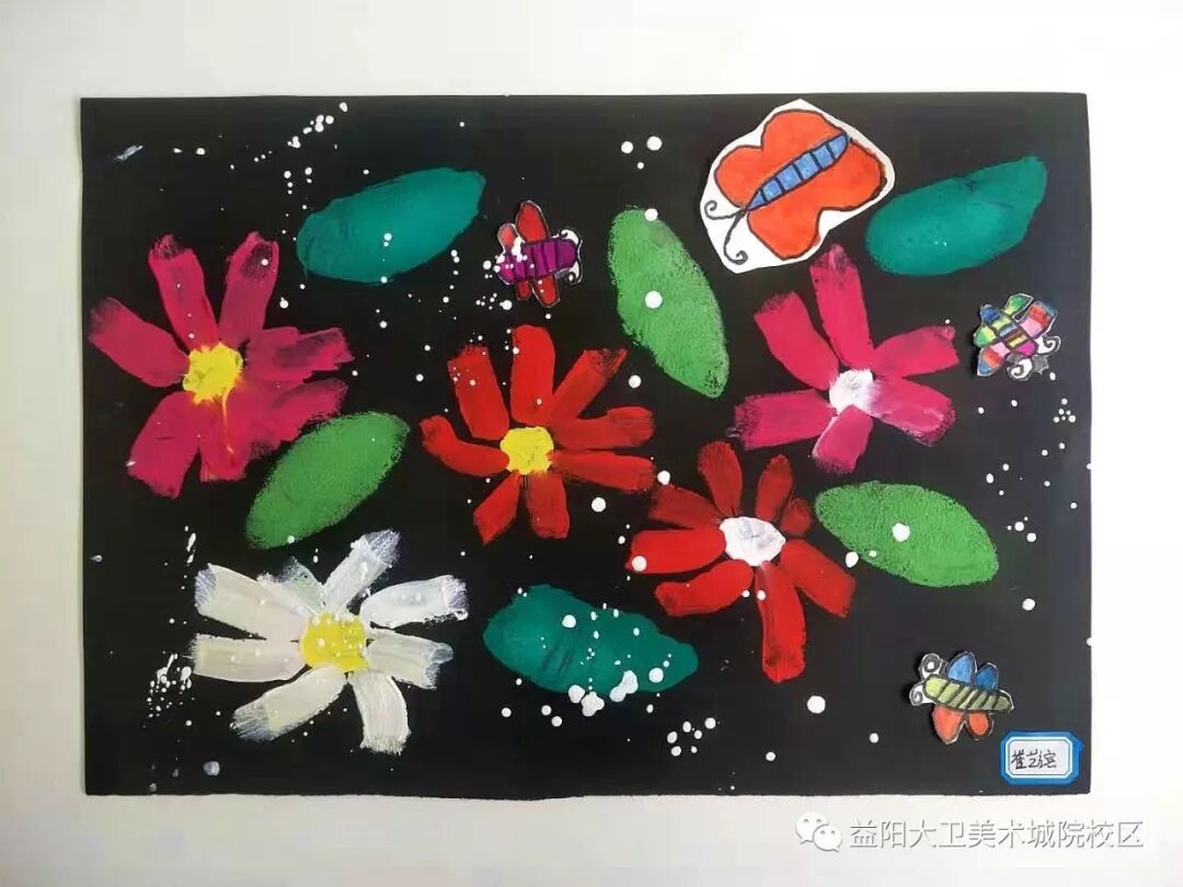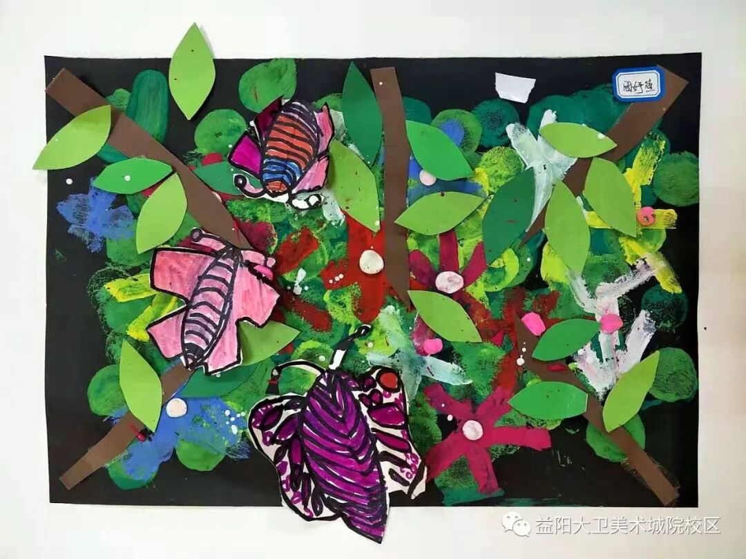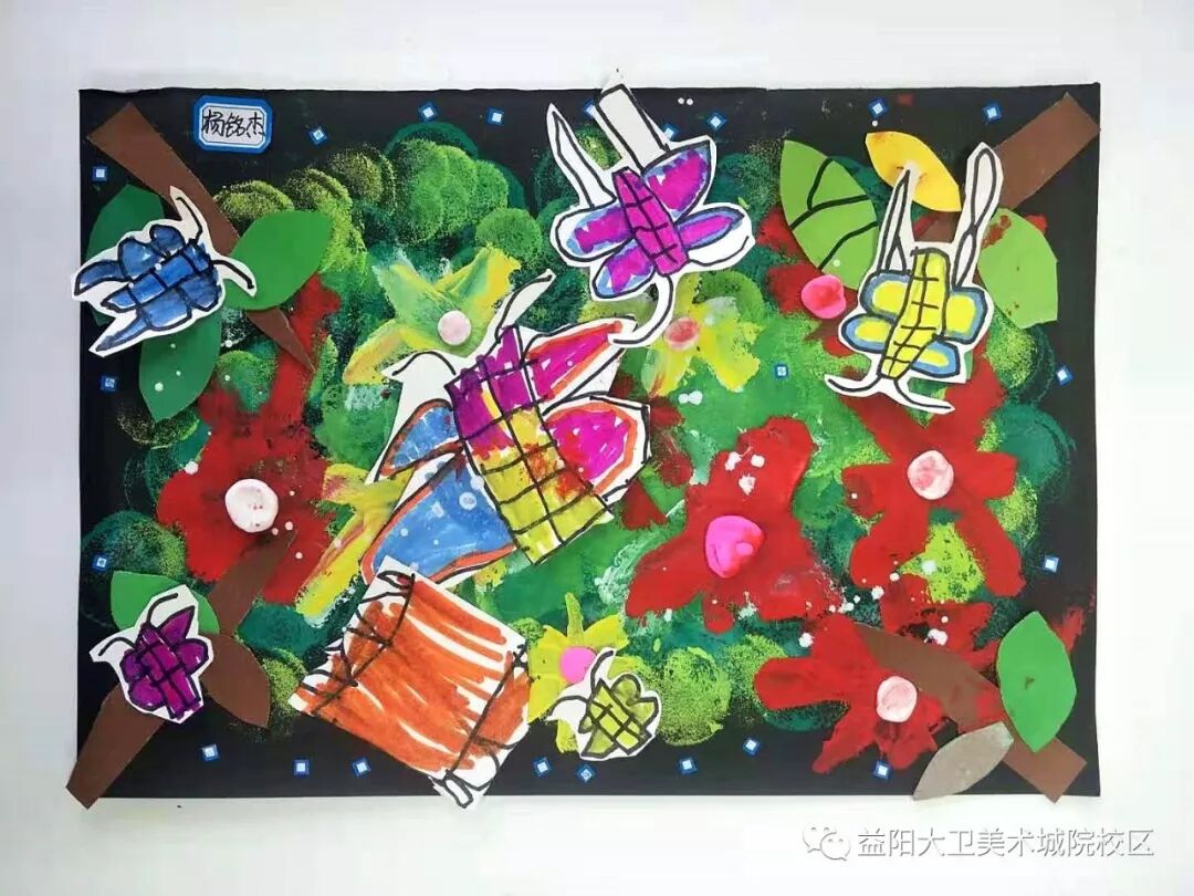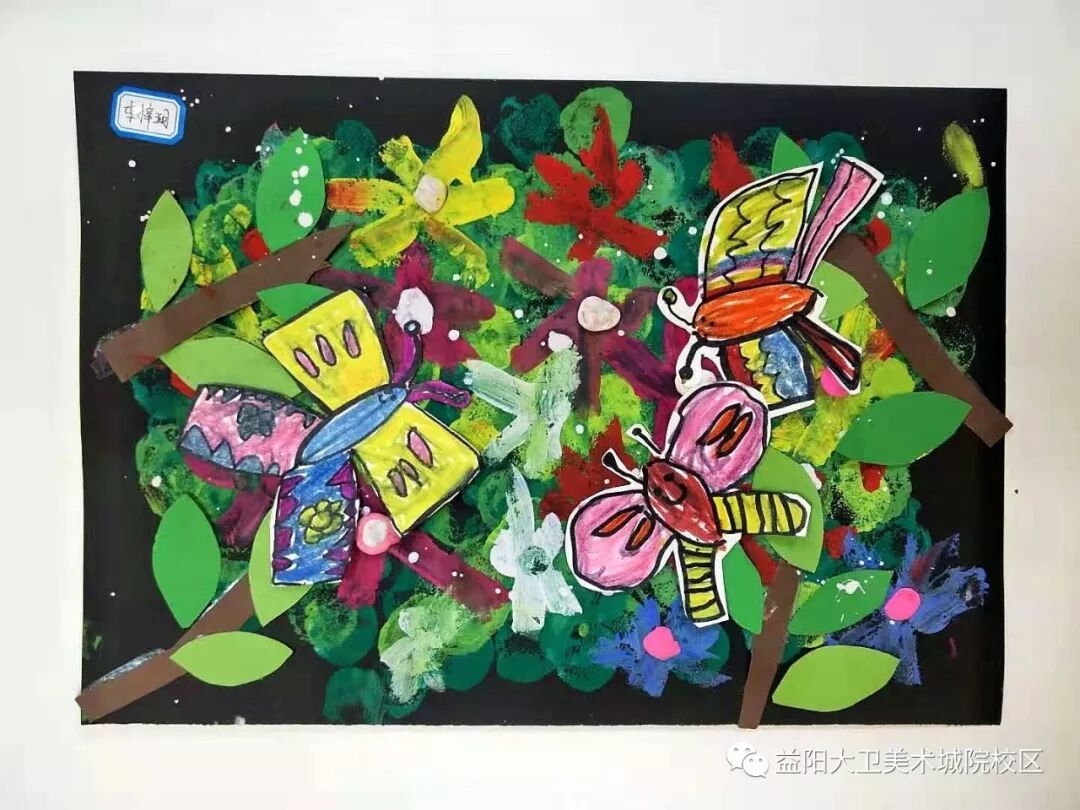 《花丛里的蝴蝶》主要学习了形状的对称和色彩的深浅变化。作品以水彩颜料和勾线笔水彩笔上色的形式完成,用海绵棒拓印出花丛的背景,画上各种颜色的小花朵,运用对称画出一只只漂亮的小蝴蝶。