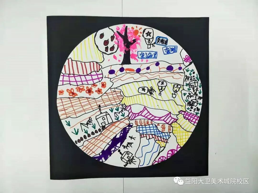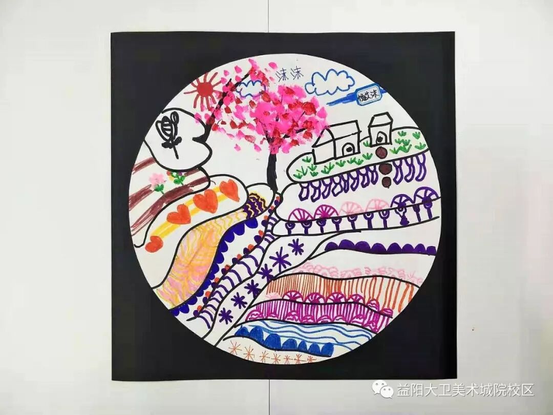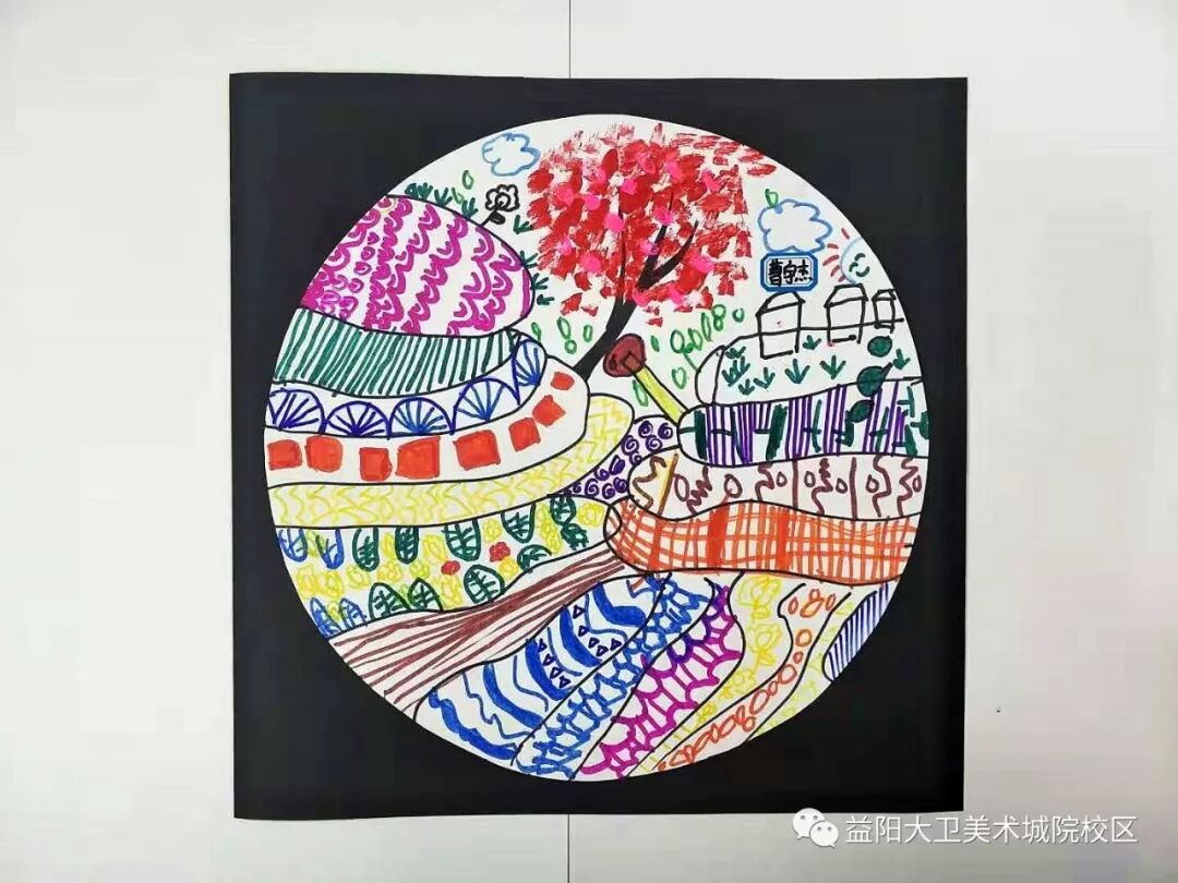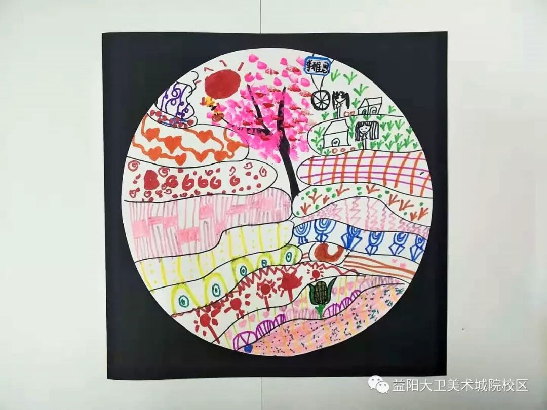 线条有疏密变化的排列和组合及不同类型的线条有不同规律的排列组合。作品的绘画方式采用圆形构图,梯田中的农作物用不同的色彩,不同的线条来表达出一幅梯田的作品。