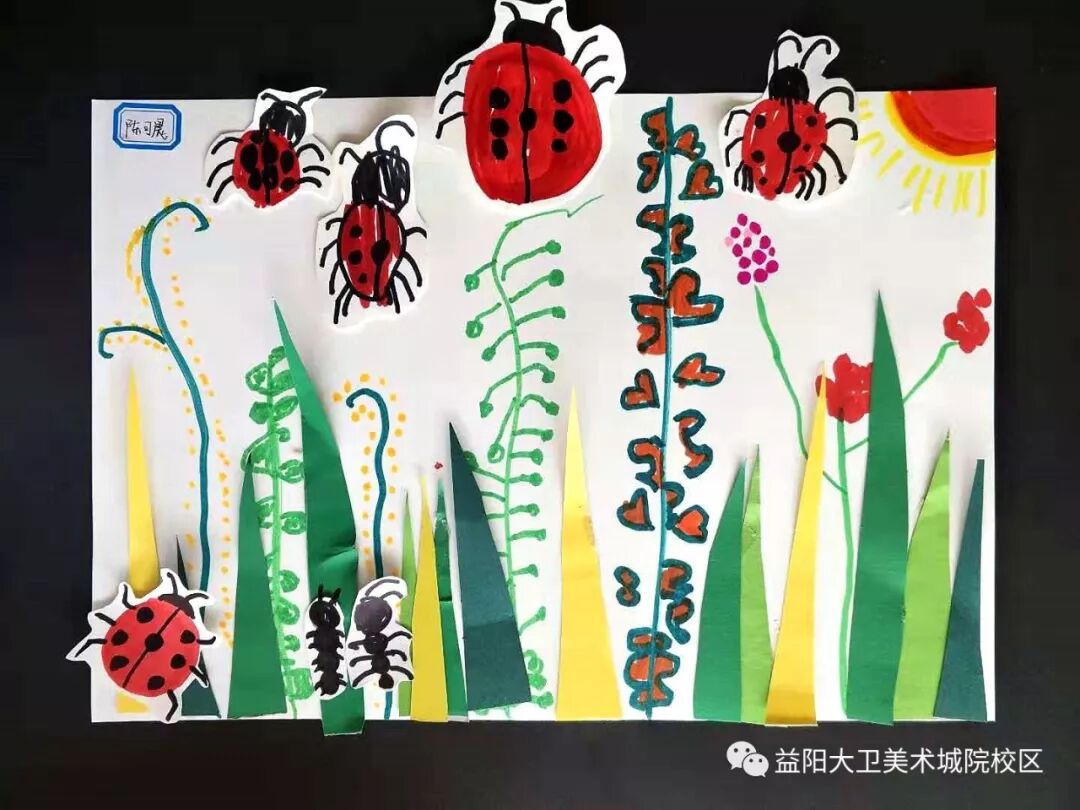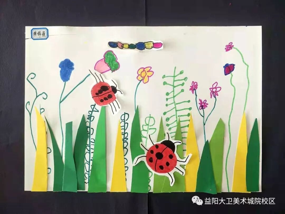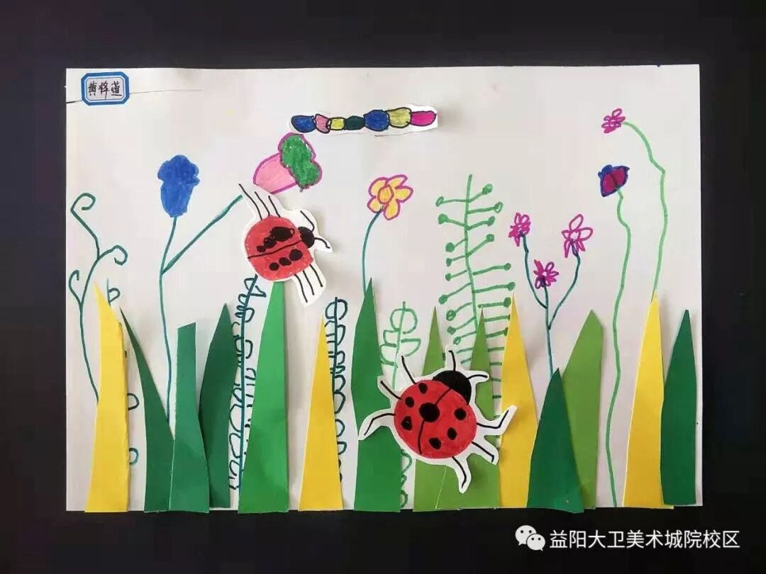 《形状变变变》知识点:形状的联想。色彩的渐变。线条的运用。作品以水彩笔和剪贴的方式完成的,用各种绿色的水彩笔画出线描的草和花朵作为背景,再加上深浅不同的绿色三角形卡纸表现草丛,最后在草丛上画出各种小昆虫,完成了一幅各种形状组合在一起的草丛里的场景作品。