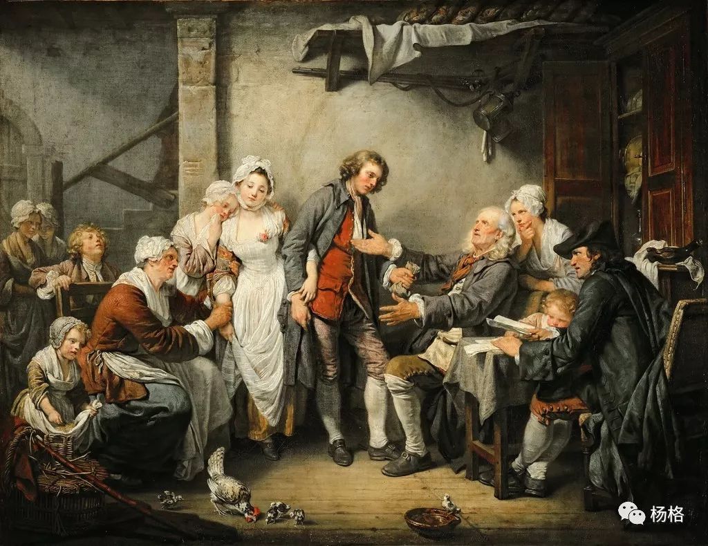 年代:1761年材质:布面油画尺寸:36 × 46.5(cm)《乡村里的订婚》是一幅描绘乡村婚姻习俗的风俗画。风俗画虽不是描绘重大事件,凡人琐事皆可入画,但通过画中人物的个性外貌、衣着饰物、环境道具以及人物之间的神情姿态动作联系,也可以体现民族的、时代的和地方的风俗习惯。在这幅画中主题思想是认为乡村订婚应在家长的同意主持下,请来公证人作证,男方还应交纳订婚礼金,这是婚配应遵循的道德规范。画中人物自然形成几个小组,整体构成有联系的半月形布局,坐立有致又形成高低疏密的节奏感,前景的鸡使画面增加生活情趣。