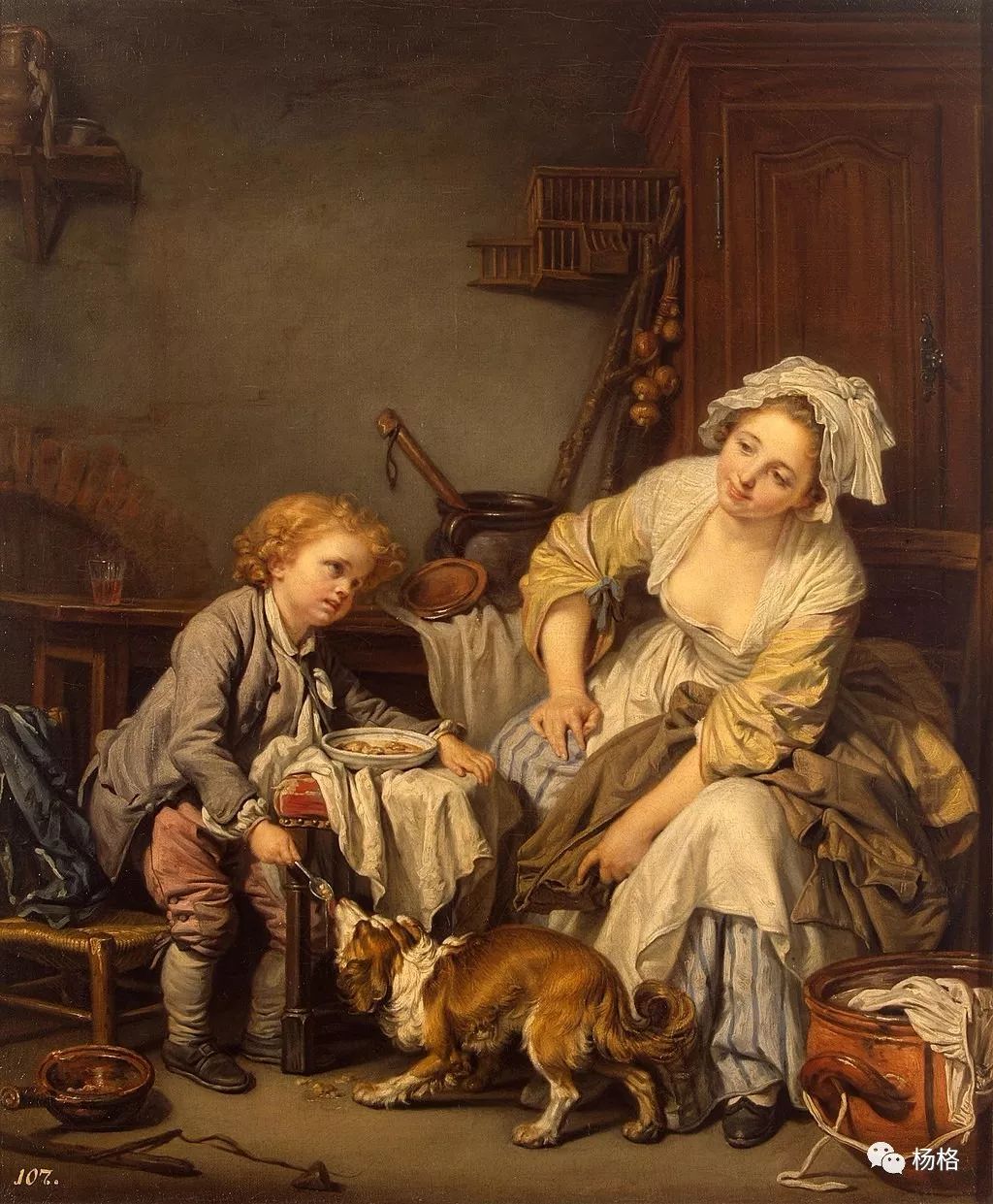 年代:1765年材质:布面油画尺寸:66.5×56(cm)收藏:艾尔米塔什博物馆,圣彼得堡,俄罗斯格勒兹30岁时去过意大利,但意大利的画风对他影响不大,他一直倾慕17世纪荷兰风俗画,因而他以启蒙民主思想为指导,将自己的古典主义艺术方法与荷兰风俗画的特有品格结合起来,形成自己的艺术道路。 《宠坏的孩子》画面情节简单,画家选择这一生活现象,意在告诫父母不要娇惯孩子,但在画中精心描绘一位身着农妇衣裳的美丽少妇以欣赏的目光看着自己蛮横的儿子。 画家运用古典主义手法,重单纯的素描色调,画中环境杂物很有生活气息,唯人物,尤其小孩的形象不太自然,小狗倒画得挺生动。