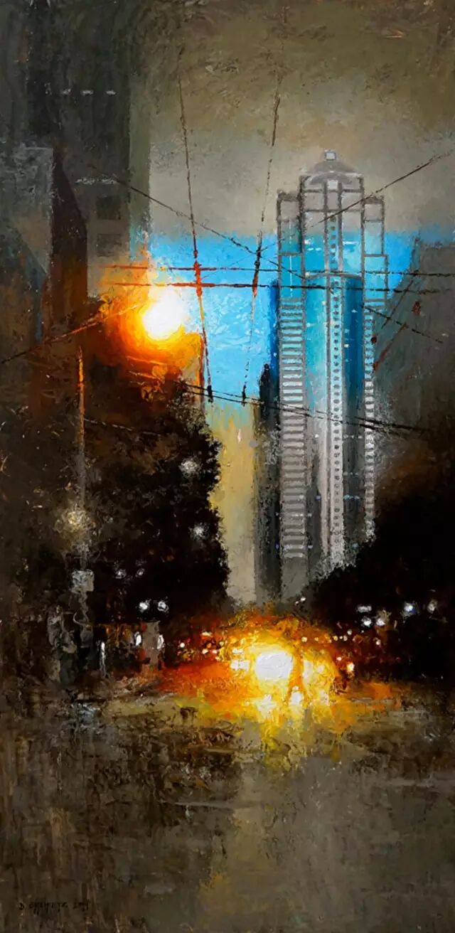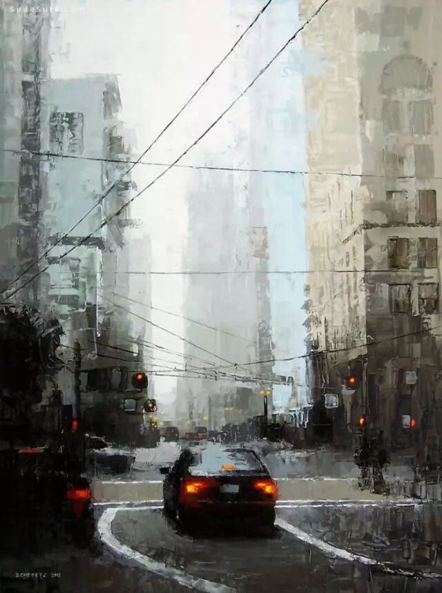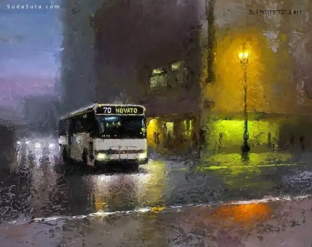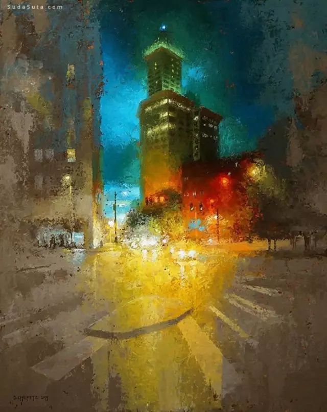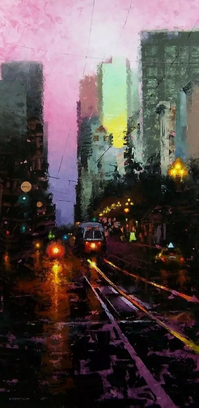 他的作品非常讲究光线,主体突出。用厚重的颜色、细腻的笔触和丰富的色彩深入勾画出环境的氛围。粗放和细腻结合,很强的视觉冲击力。