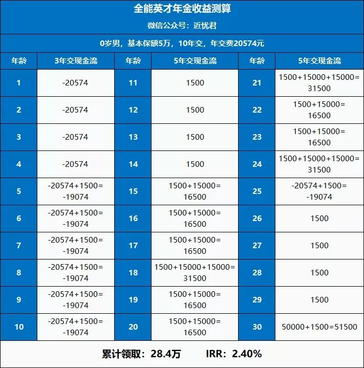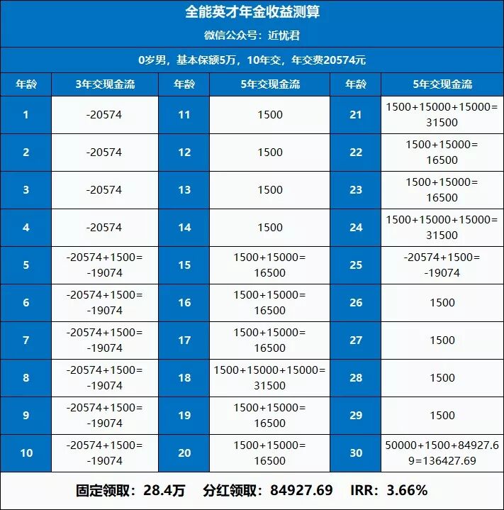 我们以官网的案例来测算一下IRR收益,看看这让人眼花缭乱的生存金领下来,到底能合年化收益几个点。