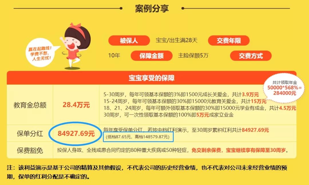 主险是一款定期年金险,只有交10年保30年一个选项。从第5个保单年度起开始领钱,不同年龄段有不同的教育金。除了固定领取的金额外,还有分红可以领取。