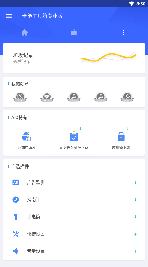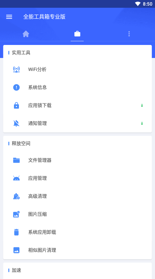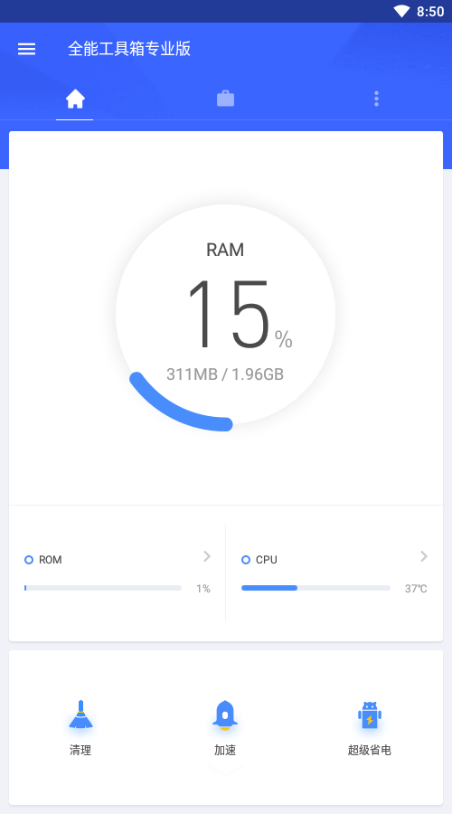 这是一款专门为安卓设备研发的综合型系统管理工具。它提供最全面的系统优化功能,包括实时内存信息展示,进程清理,缓存清理,SD卡文件管理,历史记录清除,开机项管理等等。这些功能从各个角度帮助您优化设备性能,能有效的助您解决手机反应慢、耗电快等问题。功能列表: