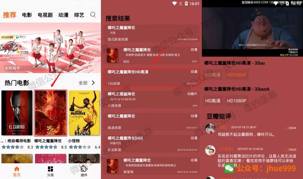 废话不多说来试试影视播放效果吧。我们点击“哪吒之魔童降世”来演示。可以看到列出来多个资源供我们选择,不同的清晰度。如图所示: