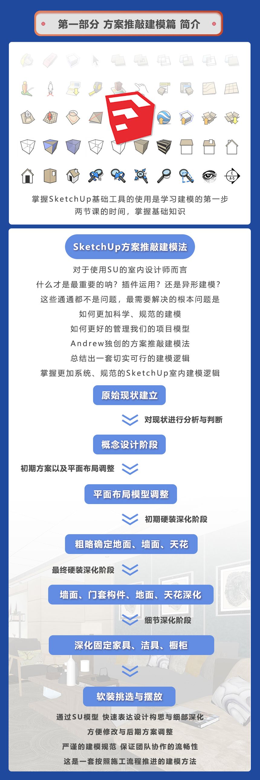 报名即送价值600元的SU室内精品模型集合报一期,免费学习下一期课程,可免费重修一次(最终解释权归Andrew所有)