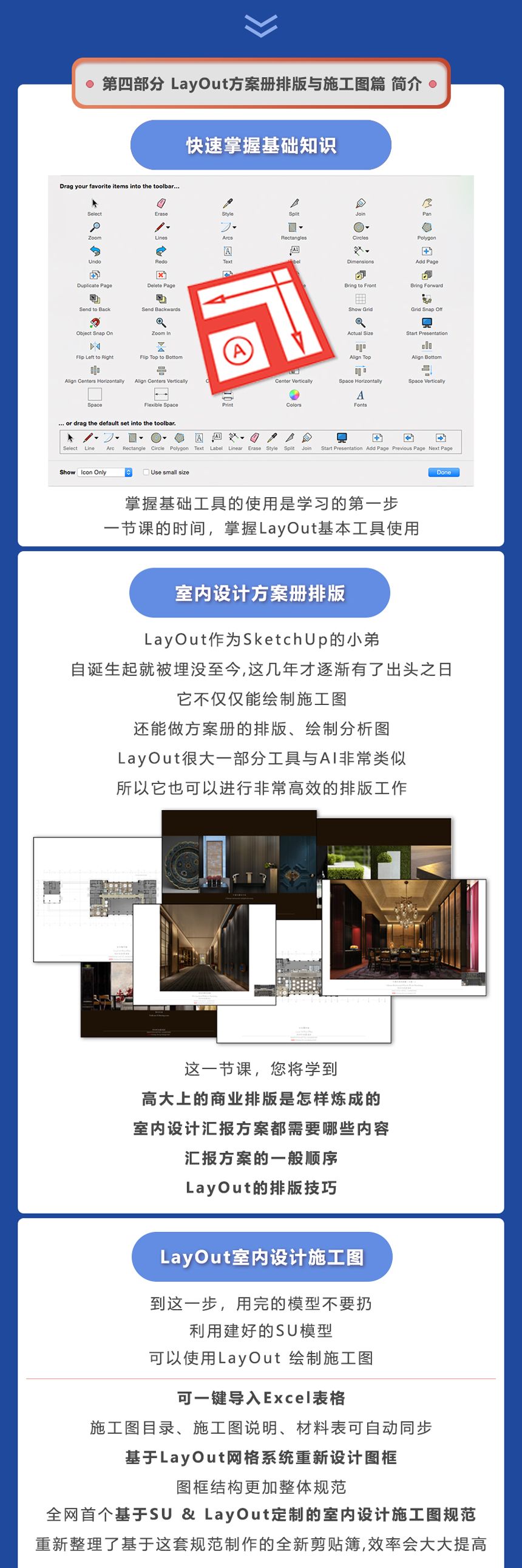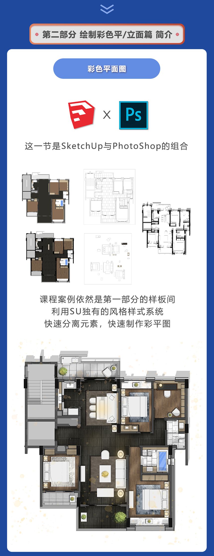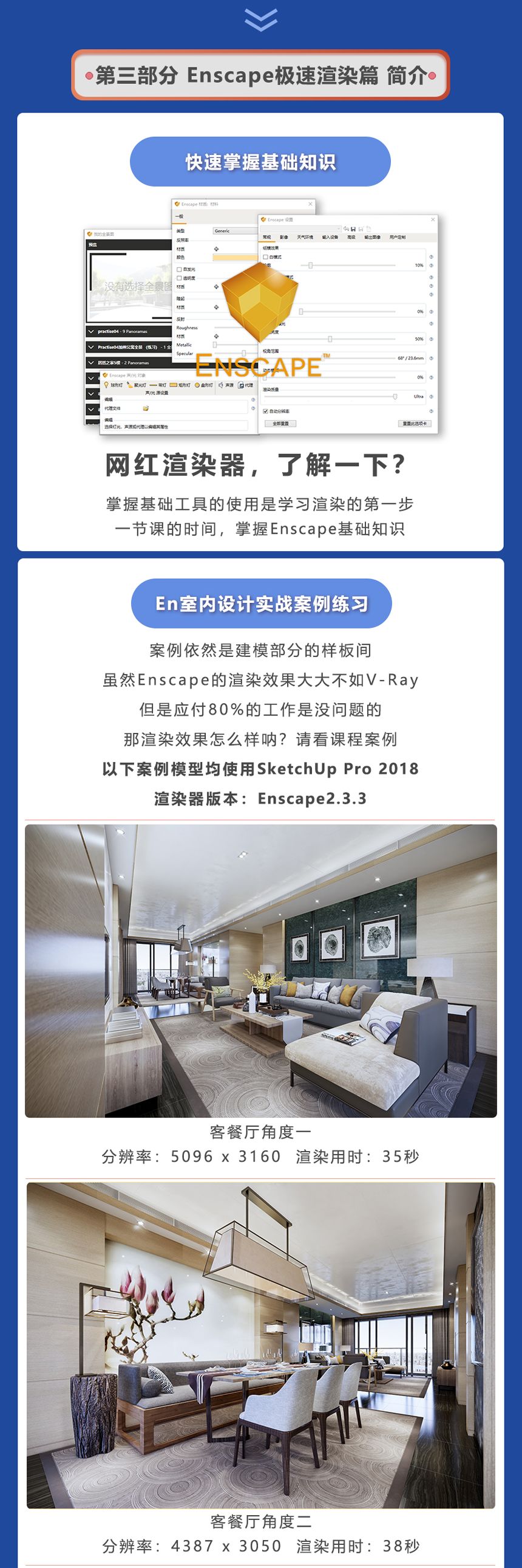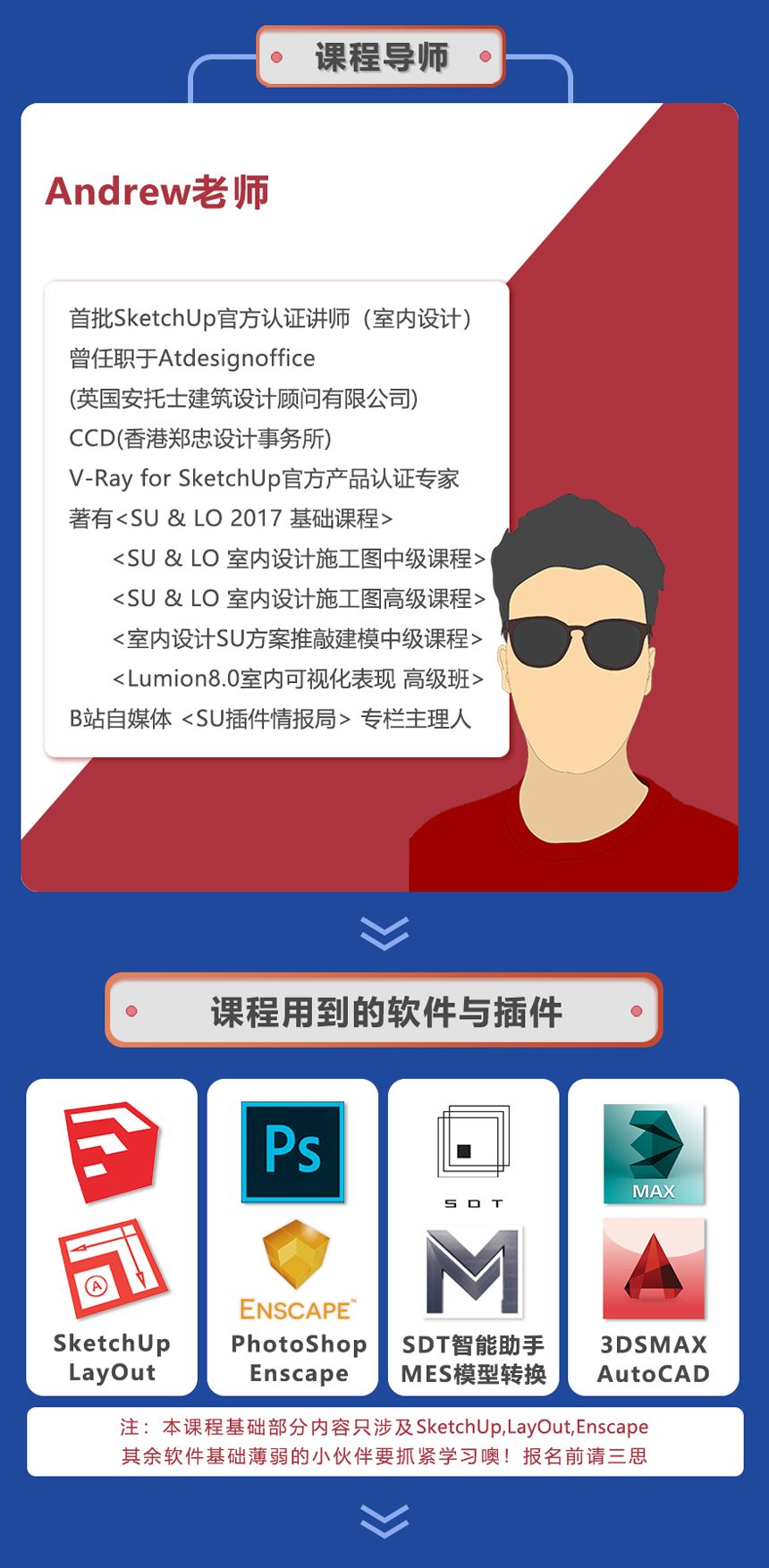 本课程基础部分内容只涉及SketchUp、LayOut、Enscape其余软件基础薄弱的小伙伴要抓紧学习噢!报名前请三思!!