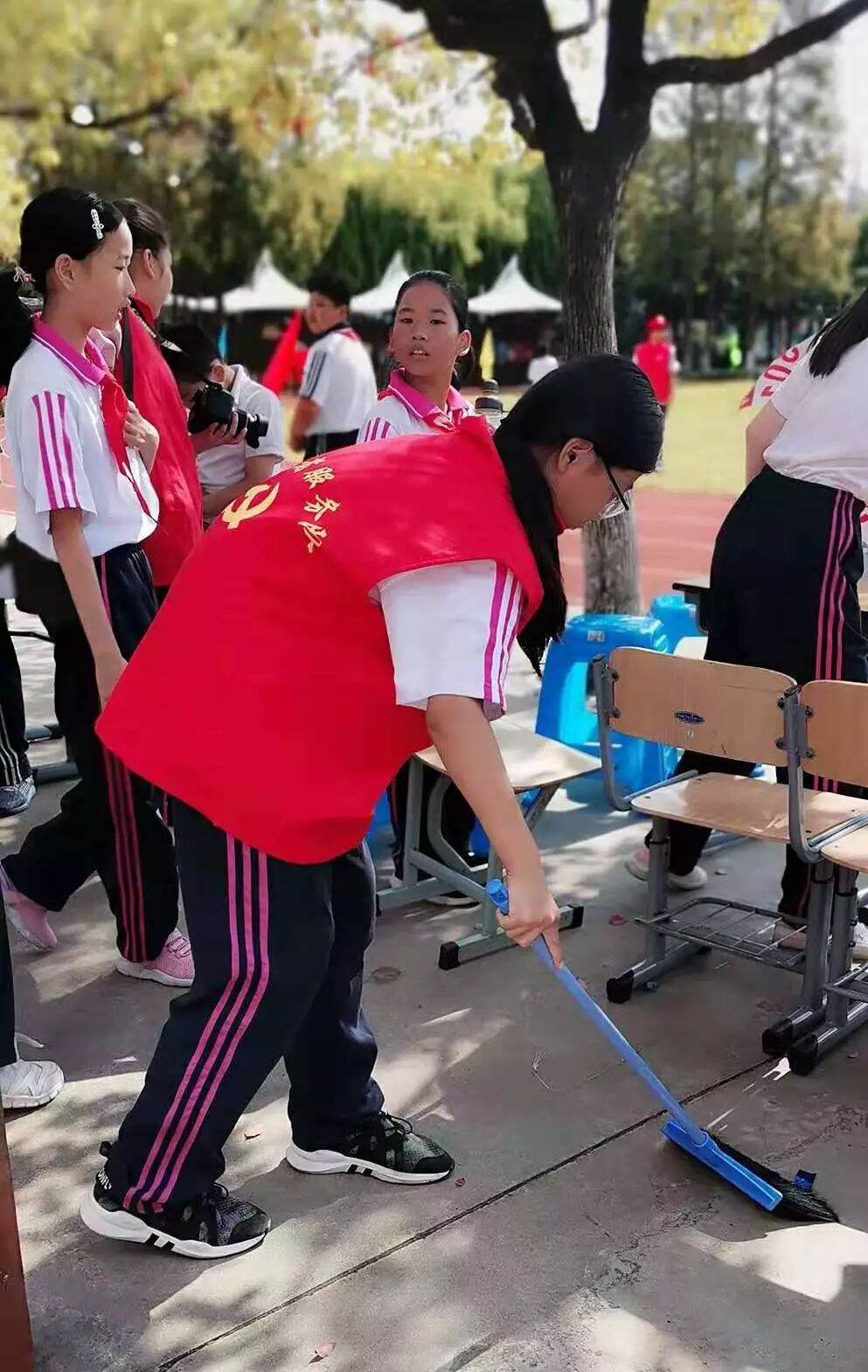 有志愿者带着劳动工具,乘比赛间隙,认真地将地面打扫得干干净净,只为构建更加美好的校园。