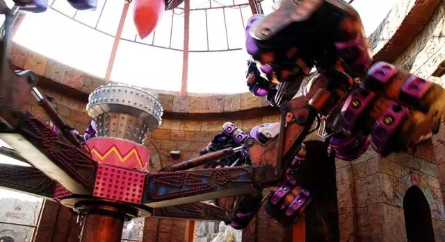 踏上这个青黑色的石板圆盘,踩着原始部落雕刻的痕迹,与石盘四周那些图腾的字符一起飞舞!抬头可以看见上方高大的帐篷,牵引顶棚的绳索挂满五颜六色的旌旗!空间仿佛凝固在一起,旋转在宇宙间。别只顾着陶醉,手可要抓紧哟,不小心被甩出去,这游戏可就要从头再来了。