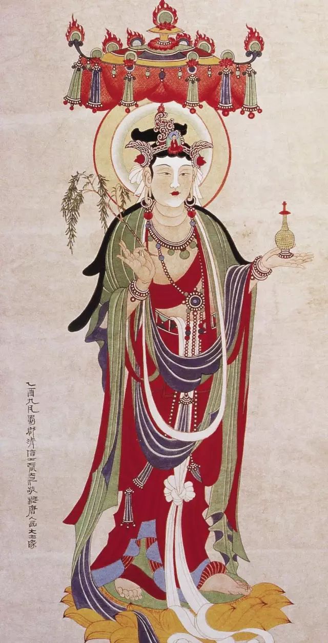 本幅写菩萨立像,见九分开脸,头束发,戴宝冠,后有顶光,手腕佩戴钏环,斜穿天衣,长帛外披,盘绕双臂,下垂及地,璎珞披身,腰结束带,下穿朱红罗裙,一手拈柳枝,一手置净瓶,双足立于朱红莲花座上。笔下开脸饱满丰腴,弯眉丰鼻,两耳垂穿环,庄严法相中见慈祥之色。眼、颊、颈以至身体各部皆晕染,色深浅不同。身上之钏环、璎珞、束带以至发髻宝冠等,则以硃砂、石青、石绿等矿物颜料填盖,色沉厚亮丽,得唐画之古艷华丽。服饰层层叠盖,以颜色深浅现其层次,突出衣褶叠曲转折的摺痕,加强质感之表现,形像更呈立体生动。画中线条沉稳,运笔熟练,细节描绘精准,尤以菩萨脸部神情、眉宇间,流露慈悲济世之怀。十指或曲拈,或平伸,其姿婉转,见柔韧之态,刻见细腻传神。本幅亦为台北故宫博物院及四川省博物馆珍藏外,少数流传于民间之张大千敦煌时期临摹壁画之代表作。