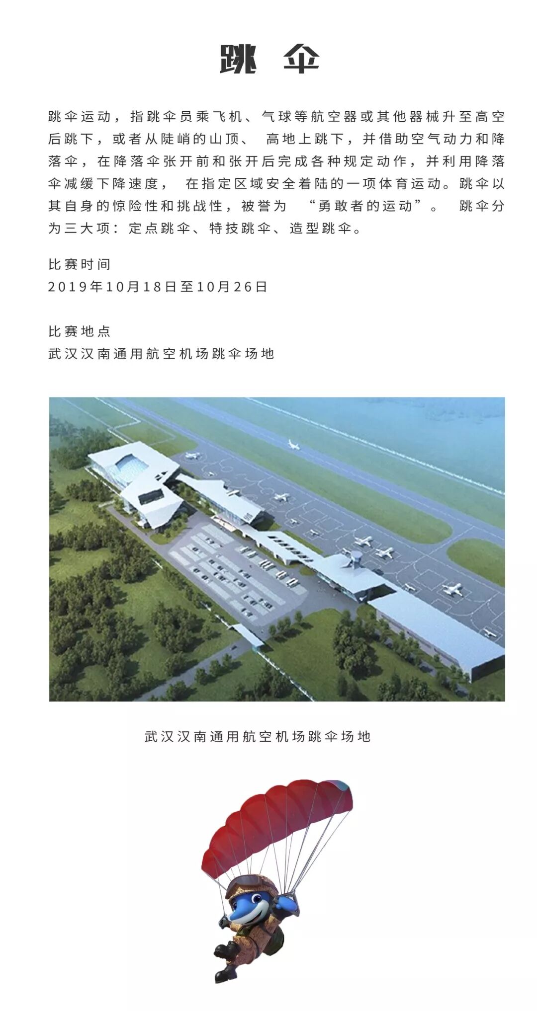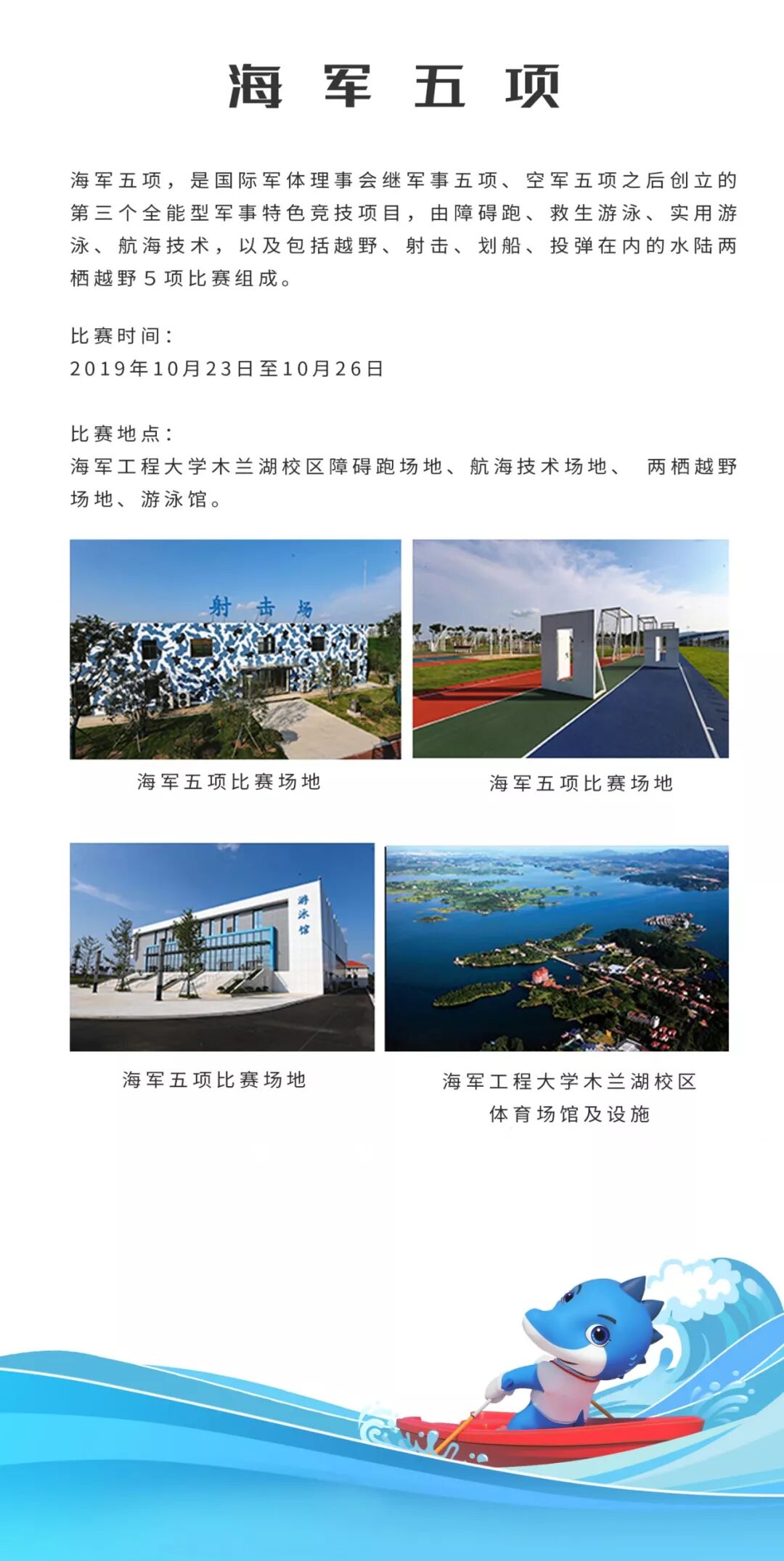 武汉军运会定于2019年10月18日至27日举行,赛期10天,共设置射击、游泳、田径、篮球等27个大项、329个小项。其中,空军五项、军事五项、海军五项、定向越野和跳伞5个项目为军事特色项目,其他项目为奥运项目。