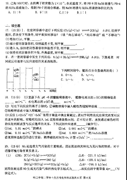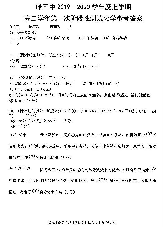 化学 | 2019-2020哈三中【高二】第一次月考试卷+答案