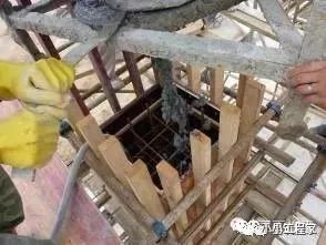 ⑵ 采取垂直振捣和斜向振捣两种振捣方法,柱墙垂直振捣,梁板斜向振捣。