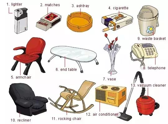 1.lighter 打火机2.matches 火柴3.ashtray 烟灰缸4.cigarette 香烟5.armchair 扶手椅6.end table 茶几7.vase 花瓶8.telephone 电话机9.waste basket 垃圾桶10.recliner 卧椅11.rocking chair 摇椅12.air conditioner 空调13.vacuum cleaner 吸尘器8.厨房
