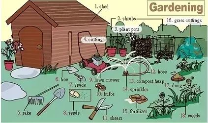 1.shed 小屋2.shrubs 灌木丛3.plant pots 花盆4.cuttings 插条5.rake 耙6.hoe 锄7.spade 铲8.seeds 种子9.lawn mower 割草机10.bulbs 鳞茎11.shears 大剪刀12.hose 软管13.compost heap 堆肥堆14.sprinkler 洒水器15.fertilizer 肥料16.grass cuttings 碎草屑17.dung 粪18.weeds 杂草16.农场