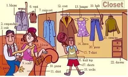 1.blazer 小西装2.suspenders 吊裤带3.suit 套装4.tie 领带5.pants 裤子6.vest 背心7.raincoat 雨衣8.blouse 女士衬衣9.scarf 围巾10.purse 女手提袋11.skirt 短裙子12.coat 大衣13.hanger 衣架14.dress 连衣裙15.T-shirt T恤16.Tank top 运动背心17.Shorts 短裤18.Socks 袜子19.Belt 皮带20.Jeans 牛仔裤21.Sweater 毛衣22.Drawer 抽屉24.便当