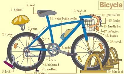 1.helmet 头盔2.spoke 辐条3.lock 锁4.seat 座子5.gears 齿轮6.rim 轮辋7.chain 链条8.kickstand 支架9.derailleur 变速器10.wheels 轮胎11.water bottle holder 水壶架12.headset 车头碗组13.pedal 踏板14.gear shifter 变速杆15.brake 刹车16.handle bar 车把17.reflector 反光灯18.basket 车篮19.shock 避震条20.bike rack 车架5.房屋外部