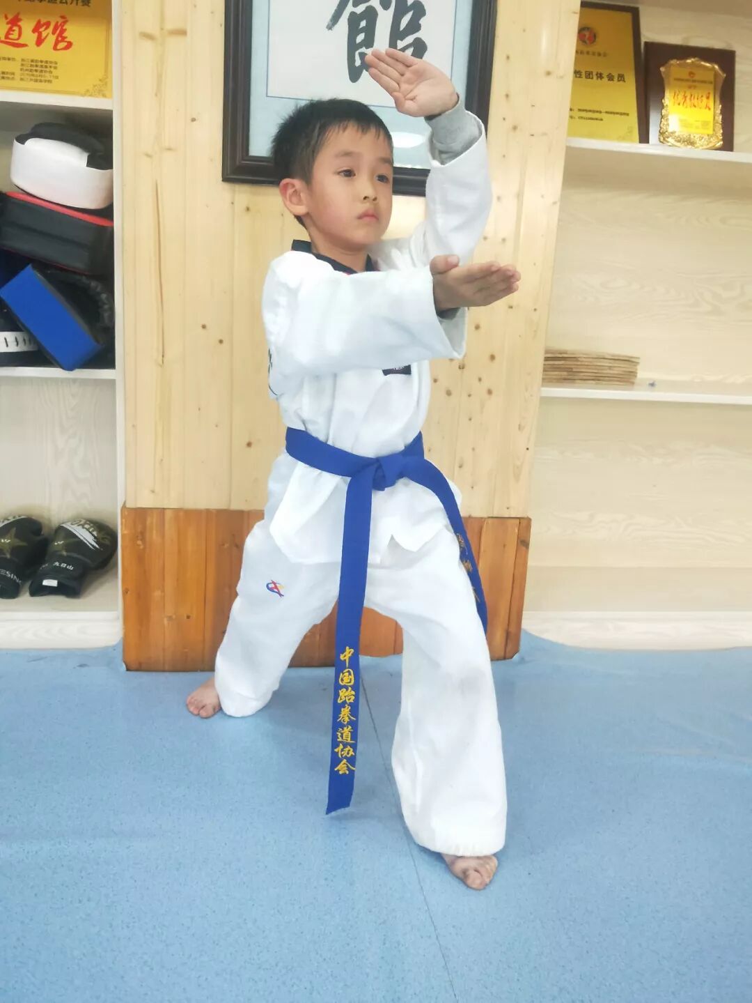 时光飞逝,今年已经是我们学习跆拳道第三个年头了。妈妈让你学跆拳道的初衷,就是为了强身健体,最后我们不但练就了强壮的体格,而且体会到了跆拳道“以礼始,以礼终”的尚武精神,懂得了尊重、礼貌、友好、谦虚和感谢!一路走来、笑过、哭过,当你想放弃的时候,妈妈就是你的打气筒,鼓励着你坚持再坚持。所有的努力和汗水都不会白付出的,在今年暑假 “浙江省青少年跆拳道公开赛“中,品势男E五章的比赛,我们获得了第三名,以及快腿王第三名。最初报名的时候,你没有信心,妈妈告诉你只要努力了就好,重在参与。但是在暑假集训的时候,你的努力告诉我你想拿奖,最后你做到了,妈妈为你骄傲!跆拳道是一个领悟坚持和磨砺意志的过程,妈妈希望你能一直坚持下去,永不言弃!