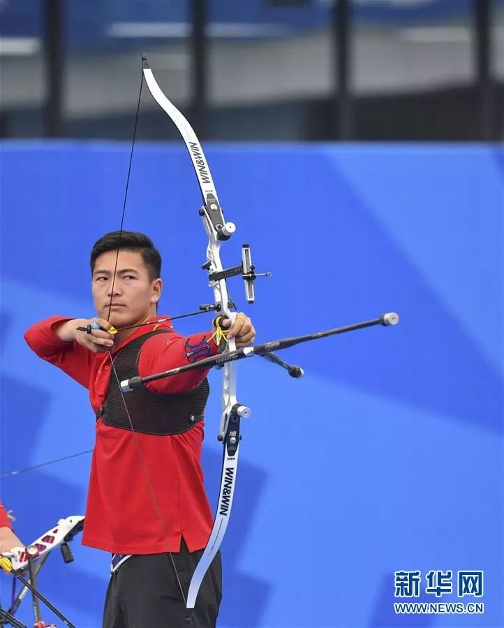10月23日,中国队选手王岩在比赛中。当日,在武汉举行的第七届世界军人运动会射箭项目男子团体决赛中,中国队以5比3击败意大利队,获得冠军。新华社记者胡虎虎摄