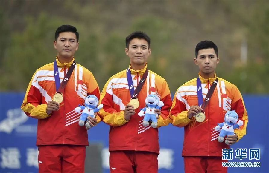 10月23日,中国队选手王岩(左)、冯浩(中)和戚凯尧在颁奖仪式上展示奖牌。当日,在武汉举行的第七届世界军人运动会射箭项目男子团体决赛中,中国队以5比3击败意大利队,获得冠军。新华社记者胡虎虎摄