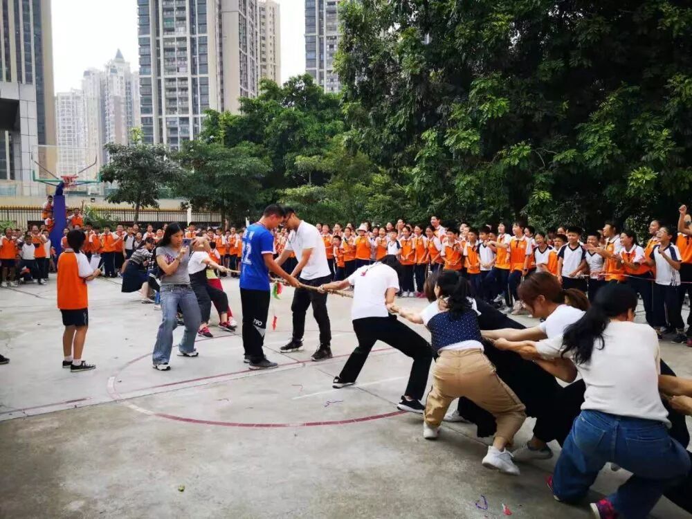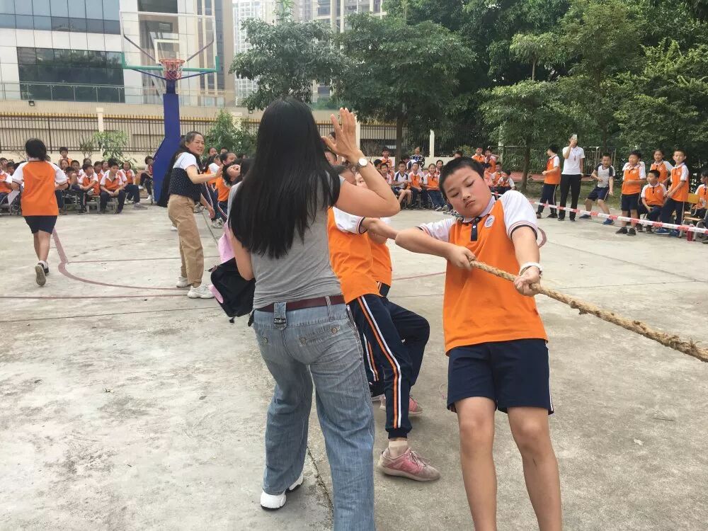 比赛前,参赛选手们的神经就像比赛的绳子一样,绷得紧紧的。随着裁判哨子的吹响,队员们突然发力,男生个个都涨得面红耳赤,青筋爆粗;女生也毫不示弱,放下了平时的淑女风范,使尽浑身力气。班主任也在队伍旁边助阵加油,恨不得抓起绳子跟学生们一起努力!