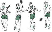 正手发高平球:姿势、动作和发正手高远球一样,只是发力方向和击球点不同, 高平球时球运行的抛物线不大使球迅速地越过对方场区空中而落到底线附近,球在空中的路线和地面形成的仰角是45°左右。