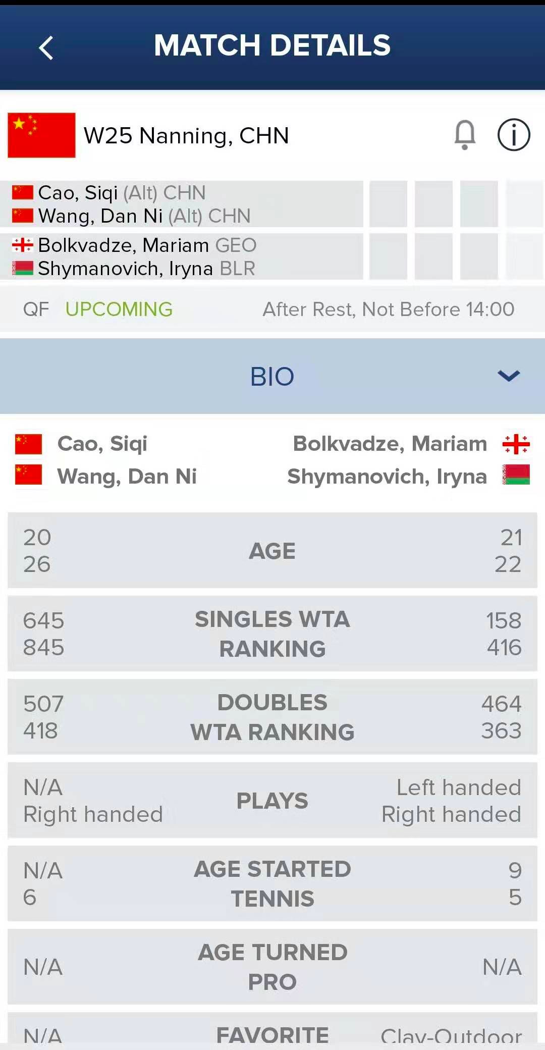 明日将进行双打次轮比赛,中国组合曹思齐/Dan Ni WANG 将对战Mariam BOLKVADZE (GEO)/ Iryna SHYMANOVICH (BLR)。