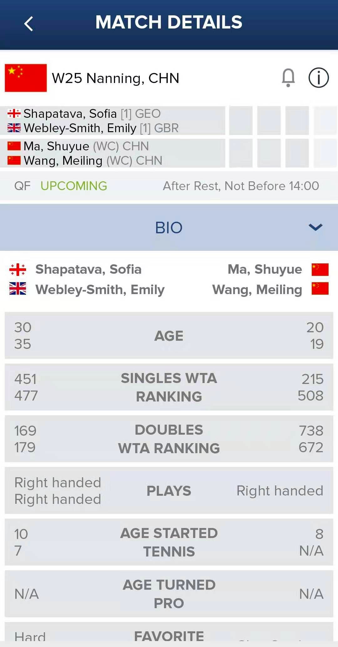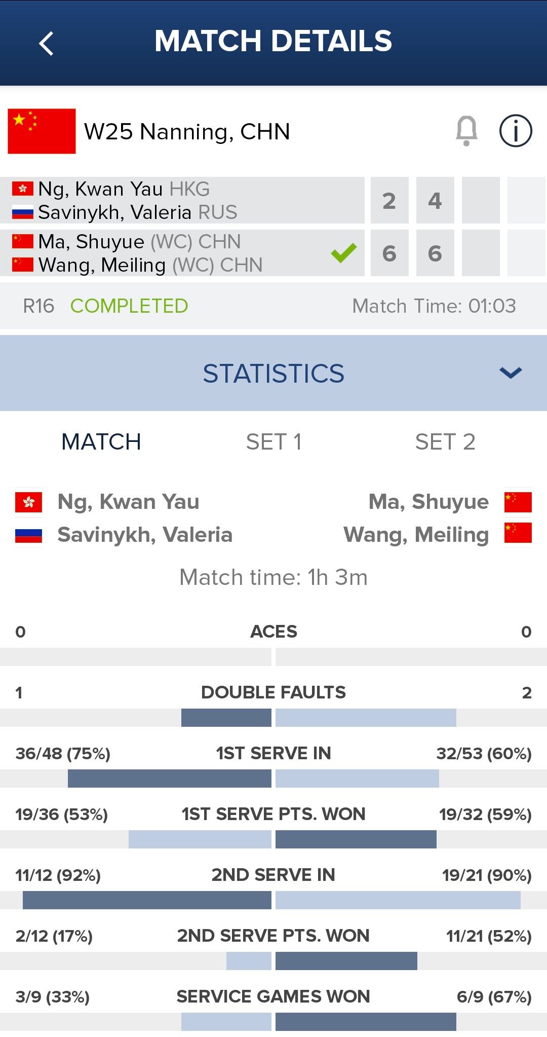 另一赛场, 中国组合马姝玥/Wang Meiling对战赛会1号种子组合Sofia SHAPATAVA (GEO) [1]/Emily WEBLEY-SMITH (GBR) [1]。