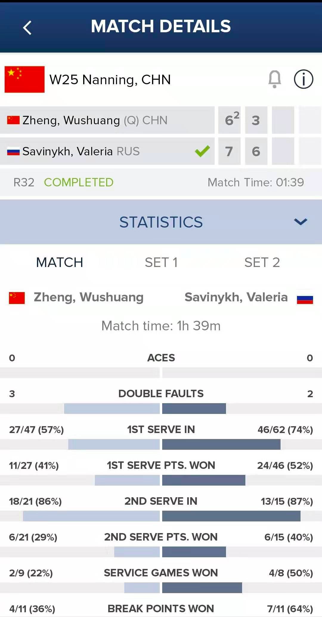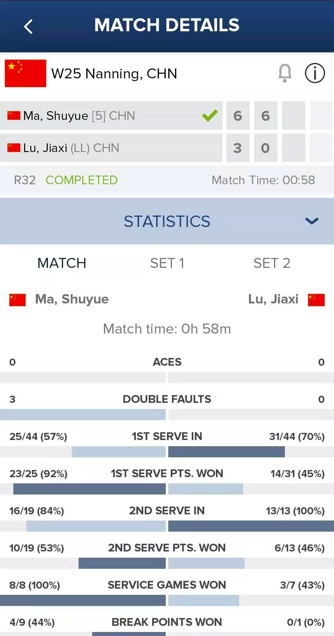 在单打首轮比赛中,5号种子马姝玥对战中国选手Lu Jiaxi,比赛仅用时58分钟,马姝玥以6-3、6-0直落两盘轻取对手,顺利晋级单打次轮。