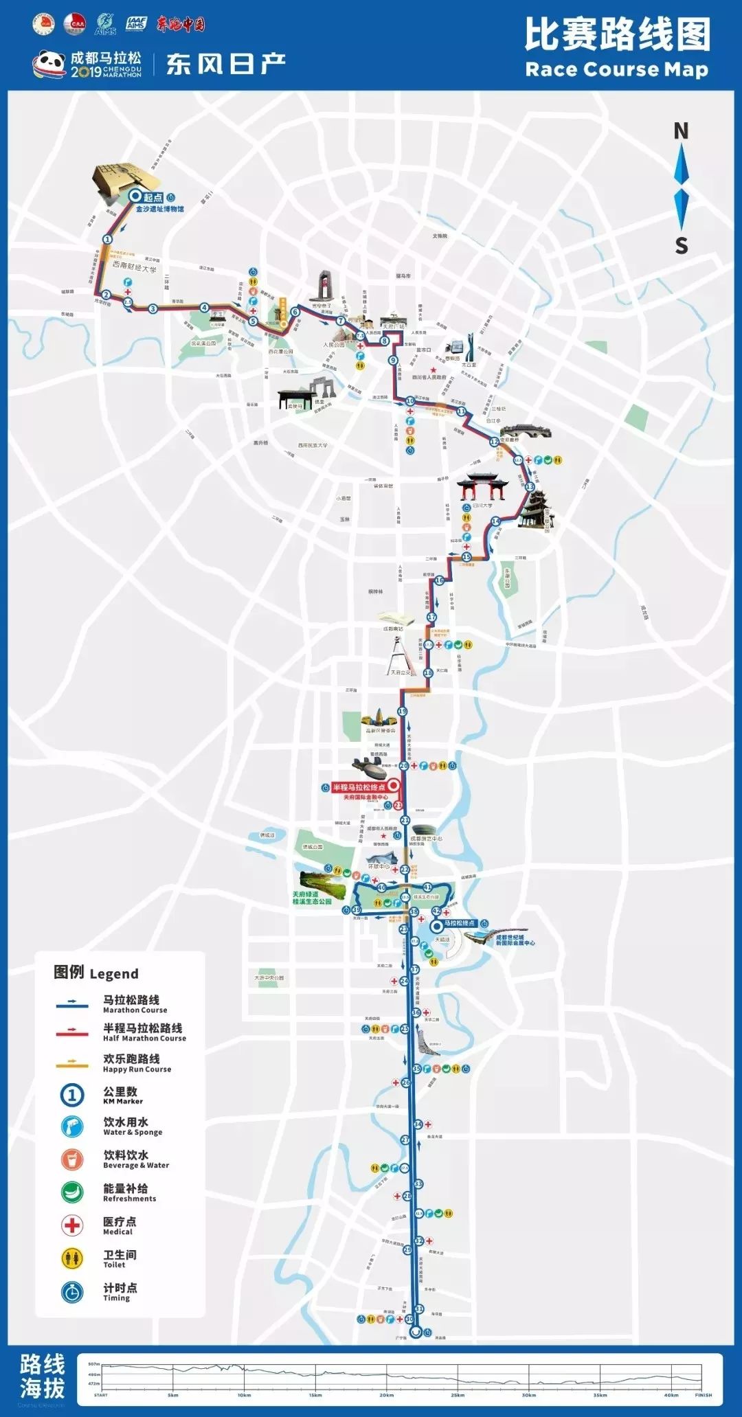 本次比赛起点设在金沙遗址博物馆东门,欢乐跑终点为文化公园,半程马拉松终点为天府国际金融中心,而马拉松终点为世纪城新国际会展中心。