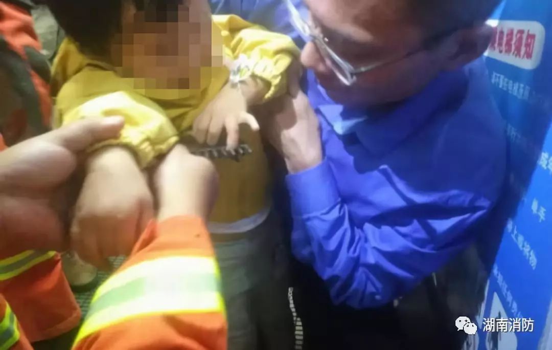 消防指战员与其家属不断安抚男童情绪,为使男童不被喷洒出来的火花灼伤,利用防护手套进行隔挡,一边加紧救援。