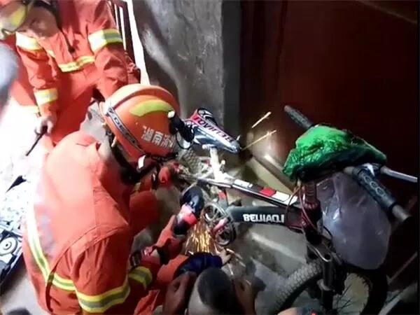 根据现场情况,消防指战员使用破拆工具对自行车链条进行破拆。