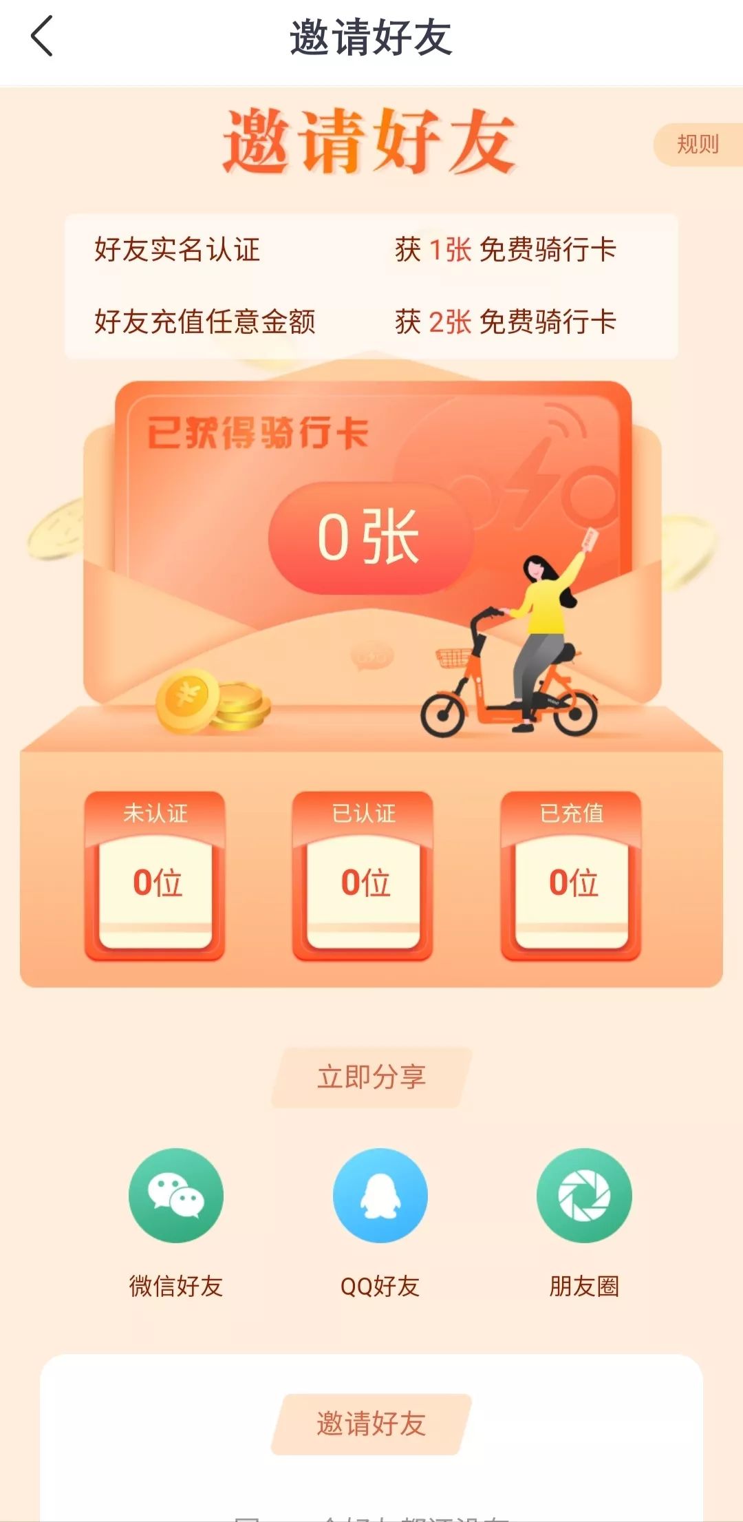 通过拜米租车APP邀请好友注册充值更有免费骑行券相送,邀请一人最多可得三张哟,快来分享好友吧!