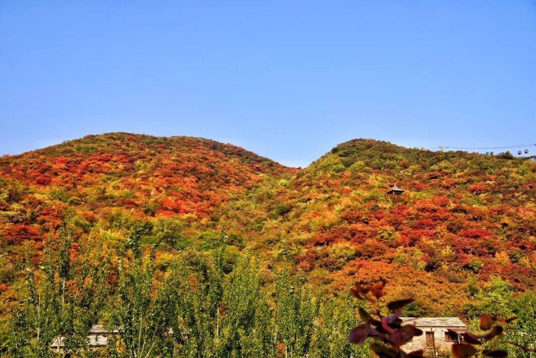 黄栌、元宝、火炬等树种已经呈现不同的颜色,视觉由远及近,颜色由黄绿相间转向浓红淡黄,迥然不同的色彩让坡峰岭傲然独立。