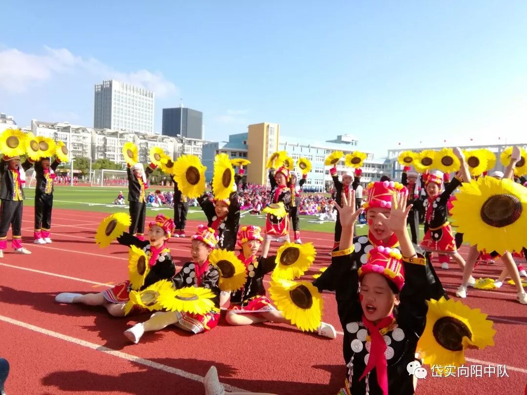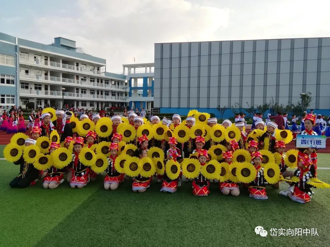 在催人奋进的运动员进行曲中,我们四(1)班向阳中队着景颇族民族服饰,迈着整齐的步伐、手执太阳花开始进场,走向主席台,向主席台的领导和观众们展示景颇族舞蹈《叮歌》,引得观众们阵阵叫好!