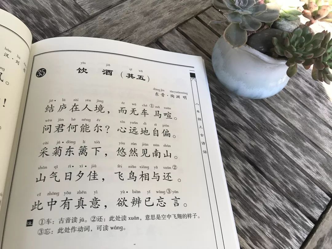此次编订,文字内容完全与语文教科书一致,注音主要根据《现代汉语词典》,参考《王力古代汉语词典》、《汉语大字典》、《康熙字典》等。翻阅教科书里选择的古诗文,其并没有自成系统,作为孩子现实的学习文本,将教材的古诗文集合成册,鼓励使用传统的诵读方法来学习,不失为一良策。如书中第35篇诗文《饮酒》(陶渊明),第36篇诗文《春望》(杜甫):