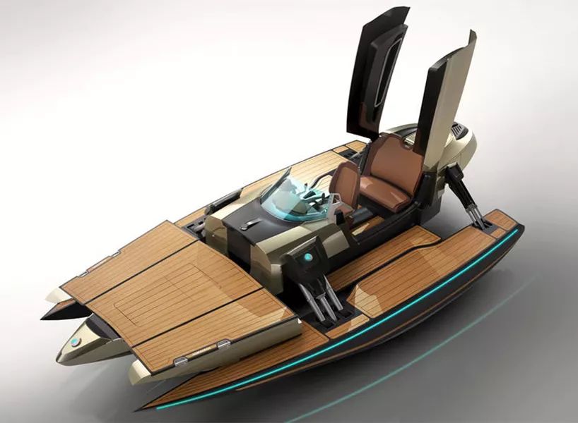 第一种是单体船,通过电子方式激活的液压臂完全向内时,外伸的支架壳折叠到中央船体中而完成。第二种是双体船,只需要激活液压臂到垂直位置,两侧的悬臂合并成一个整体,就会神奇般的变成双体船。最后一种是三体船,当液压臂完全伸展就能变成宽敞的三体船。