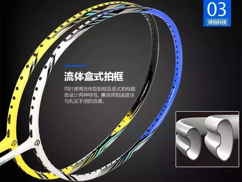同时使用流体型拍框及盒式拍框截面设计两种特性,兼具挥拍速度快与扎实手感的效果。