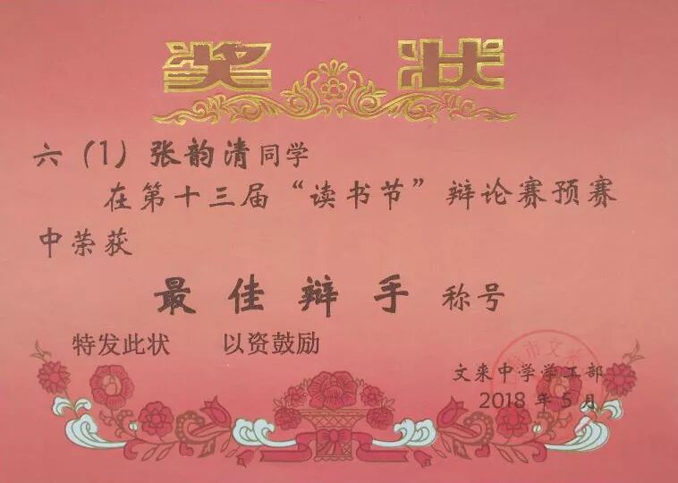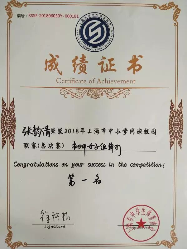 一路走来收获良多,张韵清从六岁开始学打网球,是网球教会了她要勤奋、刻苦,一分耕耘,一分收获。紧张严肃的文化课学习氛围更是激发出了她永不服输的劲头,她学习成绩名列前茅,获得学校奖学金,还写得一手好字,曾在学校硬笔书法比赛中获奖。网球还让她结交了许多志同道合的朋友,激烈的网球比赛让她认识到同侪间的竞争并不是你死我活,成王败寇。一场酣畅淋漓的比拼赢得的是一生的惺惺相惜,莫逆之交。胜负让她把自己看得更清楚,对手让她把自己变得更强大。所以,张韵清在学习上毫不吝惜和同学们分享学习心得和体会,并且积极参加班级集体活动,在第十三届“读书节”辩论赛预赛中荣获“最佳辩手”,第二届“英语文化节”参演舞台剧荣评优秀剧目。因此,获得“好队员”,“劳动积极分子”等多项荣誉。