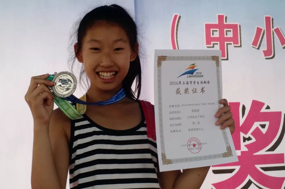 不过网球才是张韵清的最爱。八岁时,她第一次参加闵行区阳光体育大联赛网球项目的比赛,就获得当年赛事总冠军。从那以后这个比赛的总冠军就一直是她的囊中之物,无人撼动,到目前为止蝉联五届。2016年获得上海市学生运动会网球女子单打亚军。2017年,作为第一单打带领团队赢得十项系列赛网球团体第二名,取得闵行区历史最好成绩。几年下来,她在各类比赛中所获得的各种奖项可谓繁不胜举。