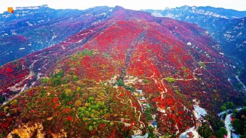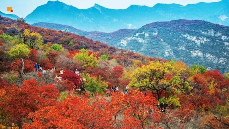 红叶密度堪称华北第一的坡峰岭,核心观赏区达两千余亩,每年秋天,二十万株野生黄栌恍若一幅繁茂磅礴的秋景油画。