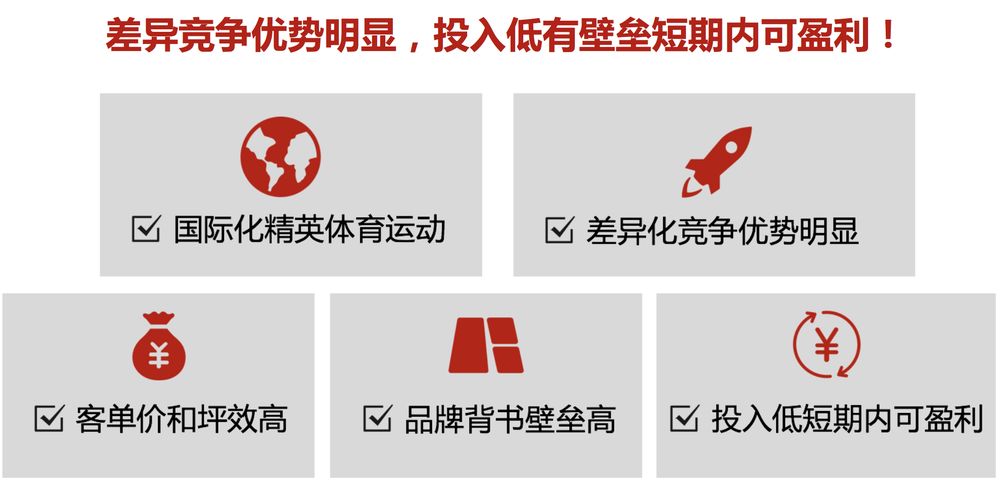 2.击剑培训相比其他培训项目(含体育培训和文艺培训)最大优势是单位面积客流量大,坪效比高,且场地投入成本低。一条18m*2m的剑道可以为5-15人同时授课练习,成本也仅仅是3万元上下,这样的效益优势是羽毛球、网球、篮球等运动项目远无法与之相比的。整体计算,若投资一个小型俱乐部,只需200平的场地,2-3条剑道,各类成本合计仅10-30万,只要招到三四十个学员,最快开业当月即可收回前期投资。