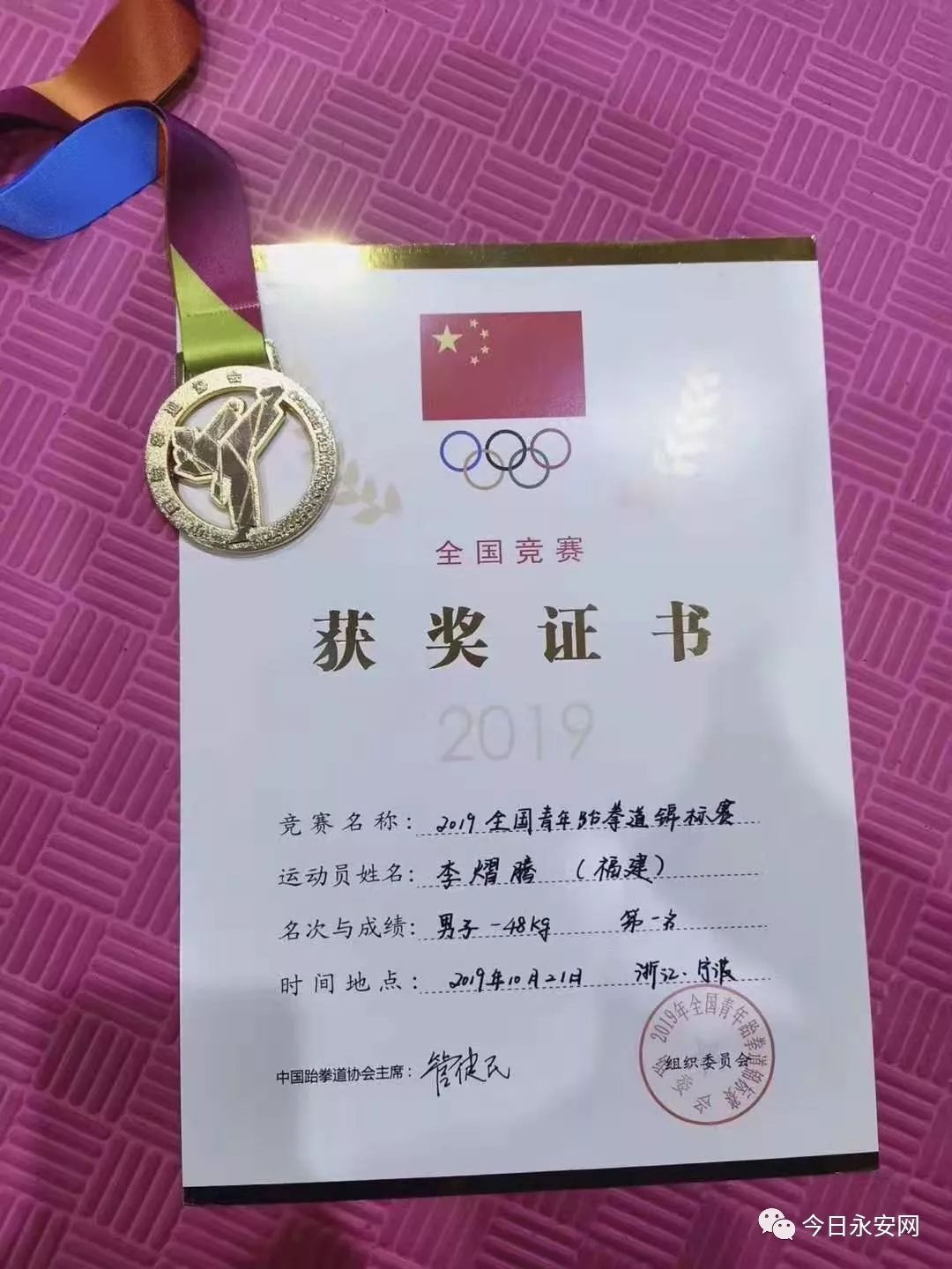 2019年全国青年跆拳道锦标赛于10月19日至22日在浙江宁波举行,由三明少体校输送的优秀运动员李熠腾在21日进行的男子48公斤级比赛中夺得冠军。