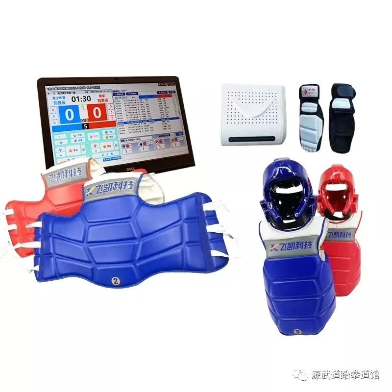 本次比赛决赛时将会首次采用和国际接轨的电子护具,使得比赛更加透明公正,比赛时间内,护具判断得分需要满足两个条件:有效的进攻接触,特定的击打力度。当进攻方穿戴的电子脚套中的电子感应芯片,接触到被进攻方的电子护甲或电子头盔的感应区域就会显示得分。