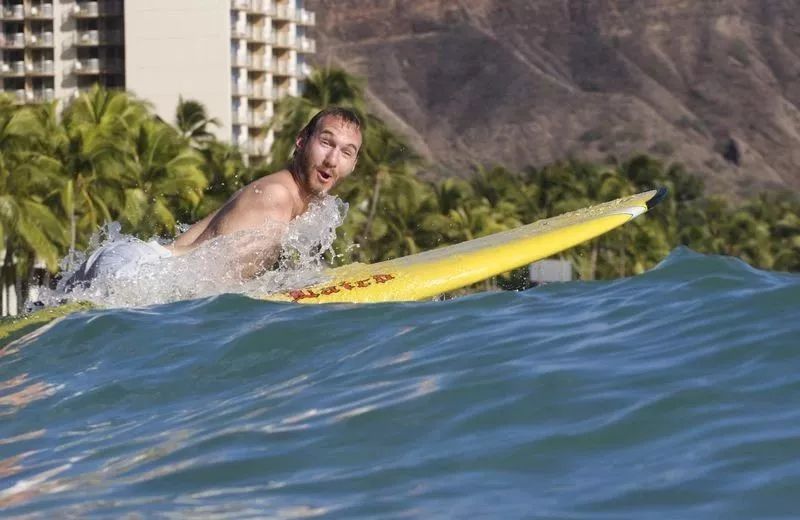 不仅如此,只有两个指头的他,不仅学会了电脑打字、游泳、潜水、骑马、踢足球、打高尔夫,甚至学会了冲浪,并能在冲浪板上完成360°旋转的高难度动作。