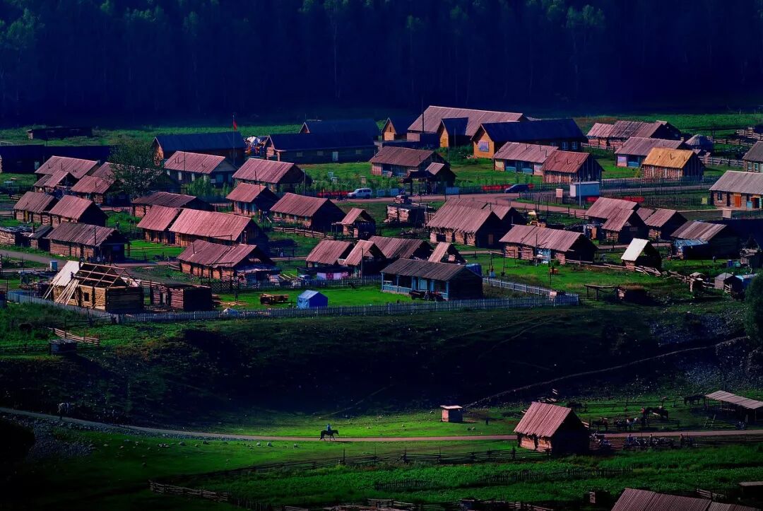 在群山环抱的开阔地上,禾木村静静地躺着,图瓦人的尖顶小木屋、牲口围栏随意地散落在村子的各个角落。