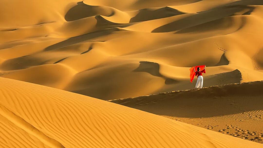 沙漠的曲线非常优美,爱美的姑娘可以穿上裙子拍摄沙漠人像,留下珍贵的回忆。