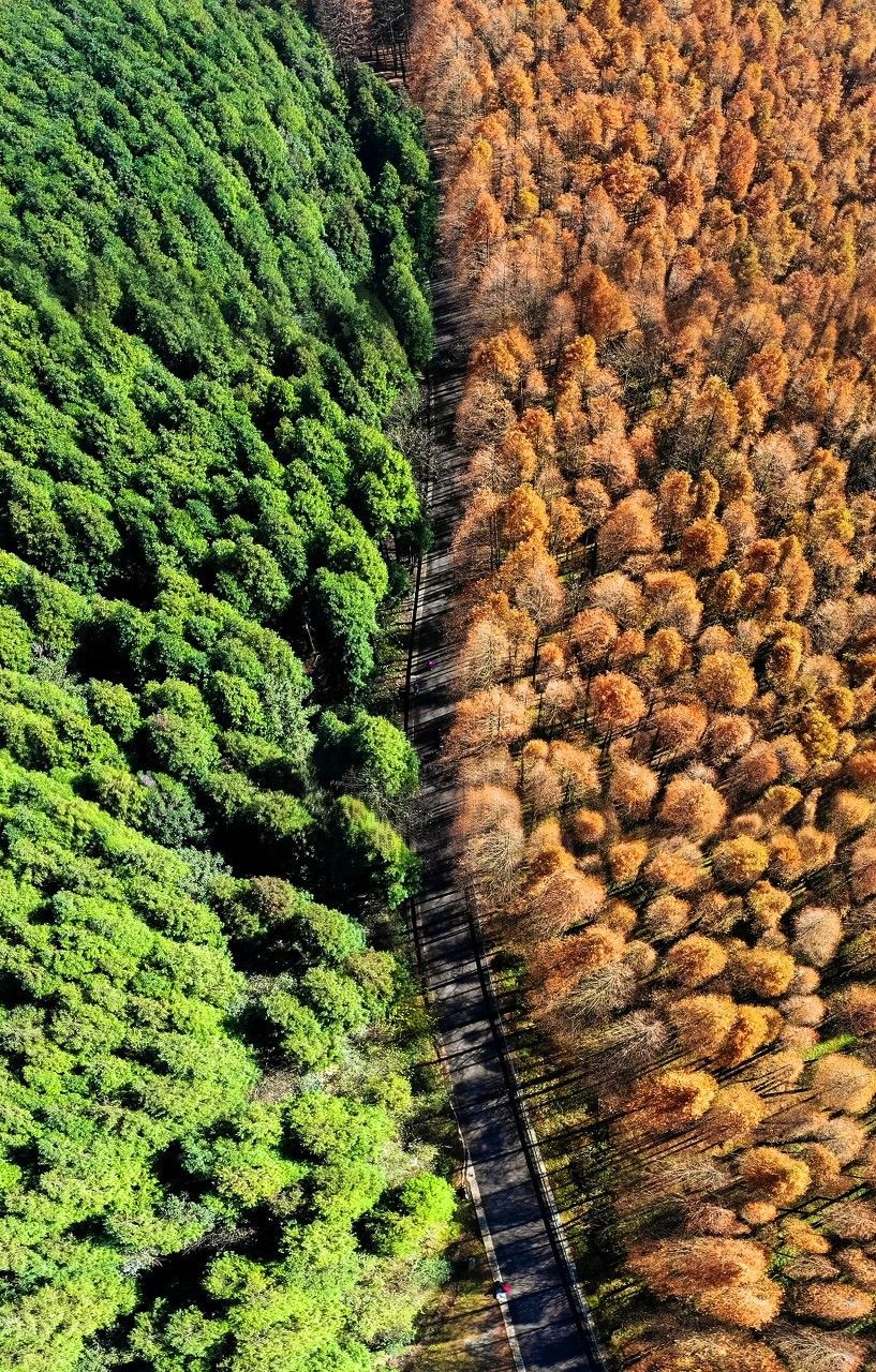 坐拥10万亩林场,每到11月,就是它最美的时候。蜿蜒的公路将森林一分为二,一边是暖黄色的水杉林,一边是墨绿色的柳杉林...
